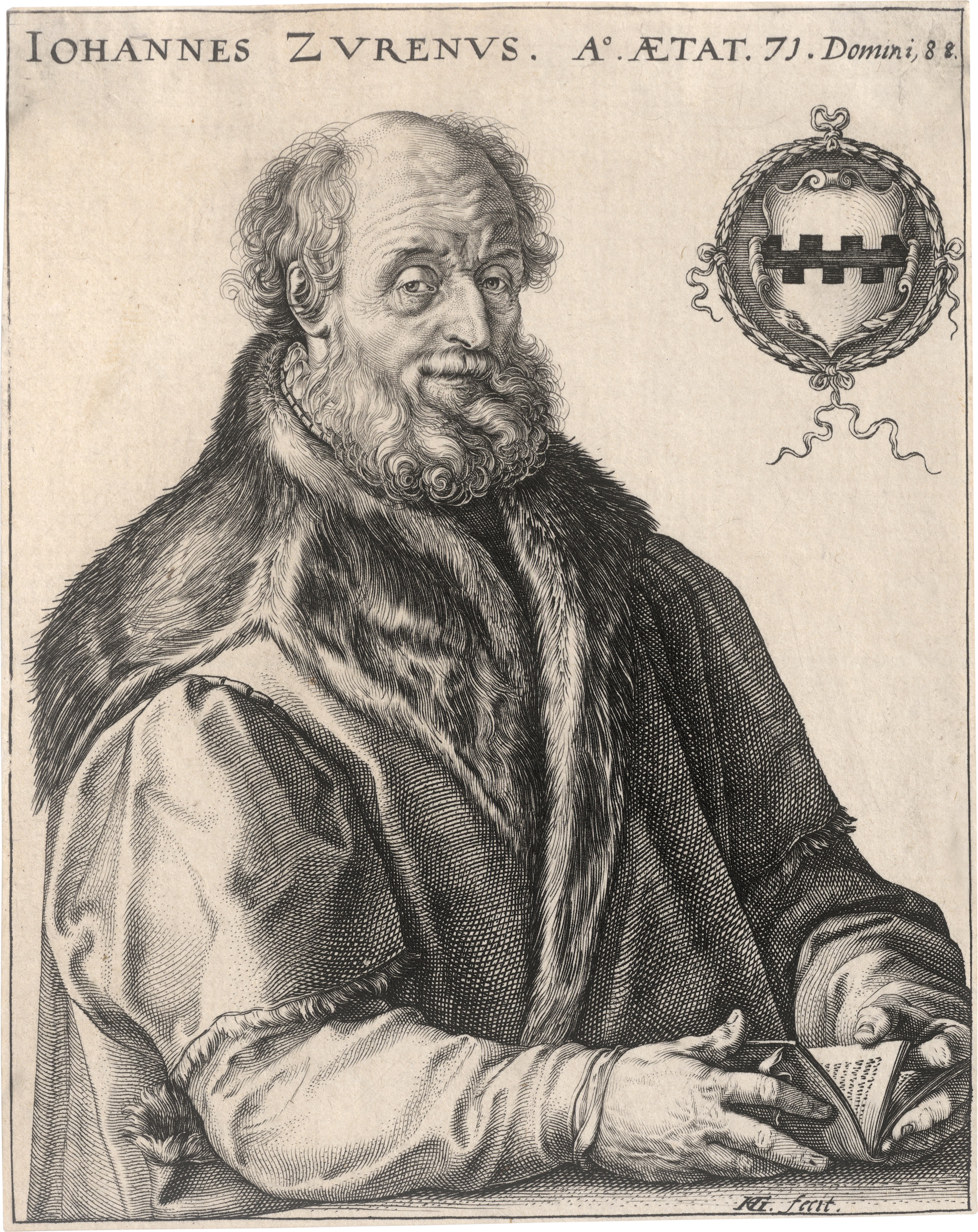 Bildnis des Graphikers und Verlegers Jan van Zuren, Bürgermeister von Haarlem. Kupferstich. 13,1 x 10,4 cm. B. 189, Hollstein 220 III, Leesberg (New Hollstein) 263 III. Wz. Bandenwappen (Fragment).