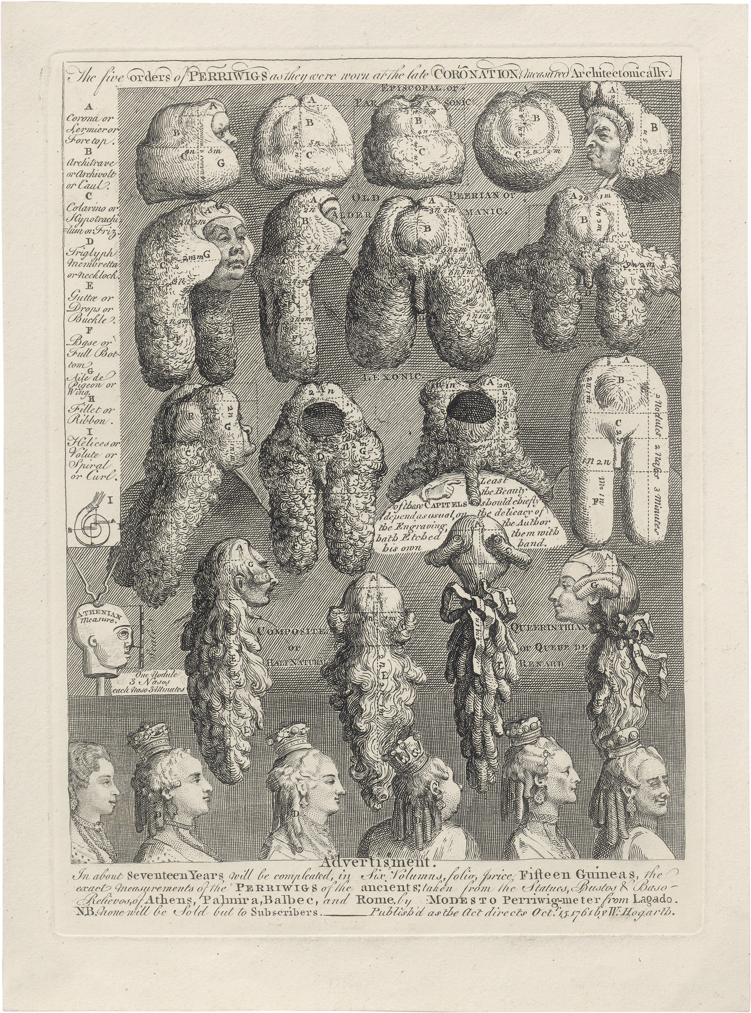 The five Orders of Periwigs - Die fünf Perückenordnungen. Radierung auf Velin. 30,2 x 22,2 cm. 1761. Paulson 209 III.