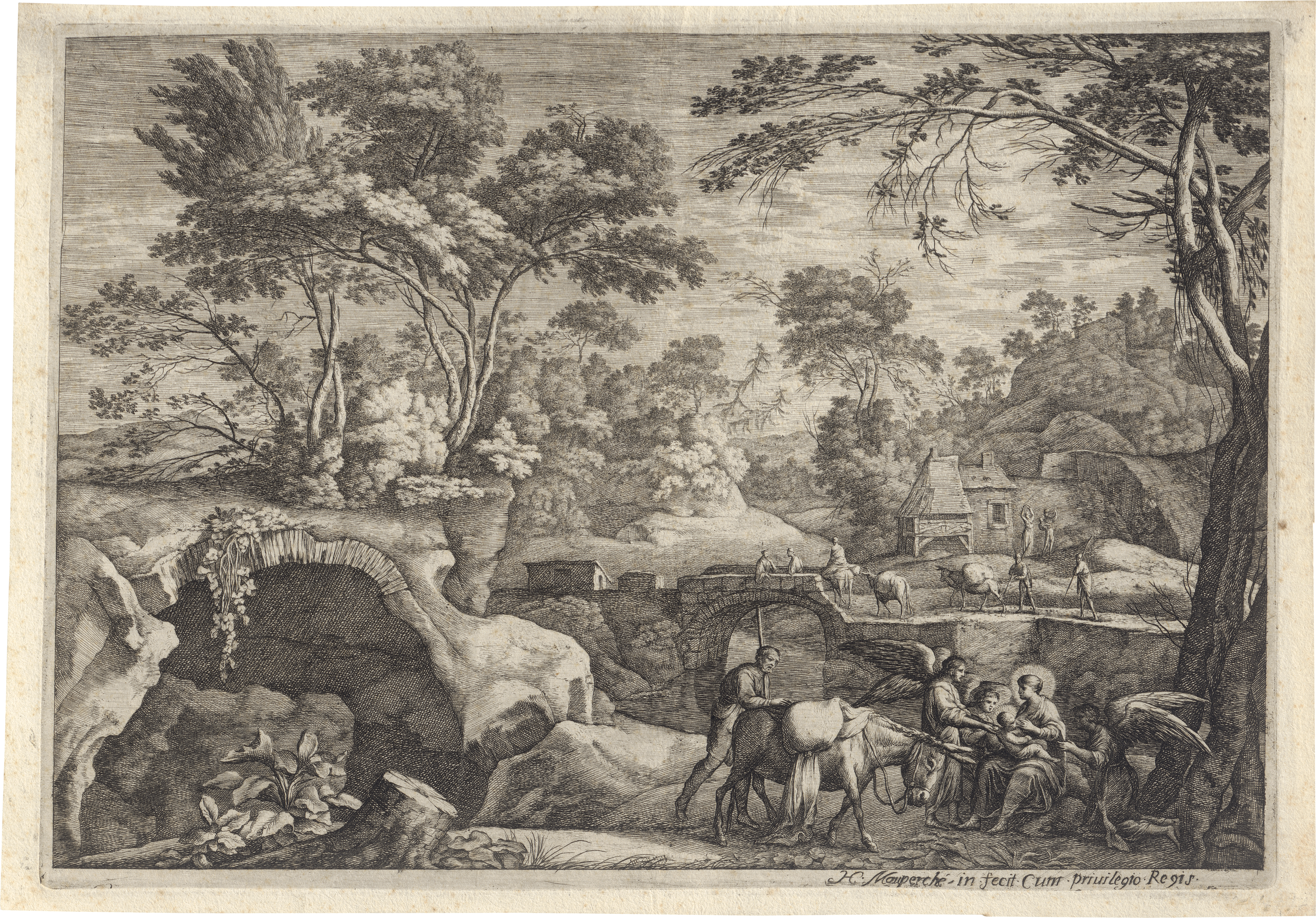 Die Flucht nach Ägypten. Radierung. 22,1 x 31,5 cm. Robert-Dumesnil 21 I (von II), Nagler 21 I (von II), Le Blanc 15 I (von II). Wz. Trauben mit angehängten Initialen "GM".