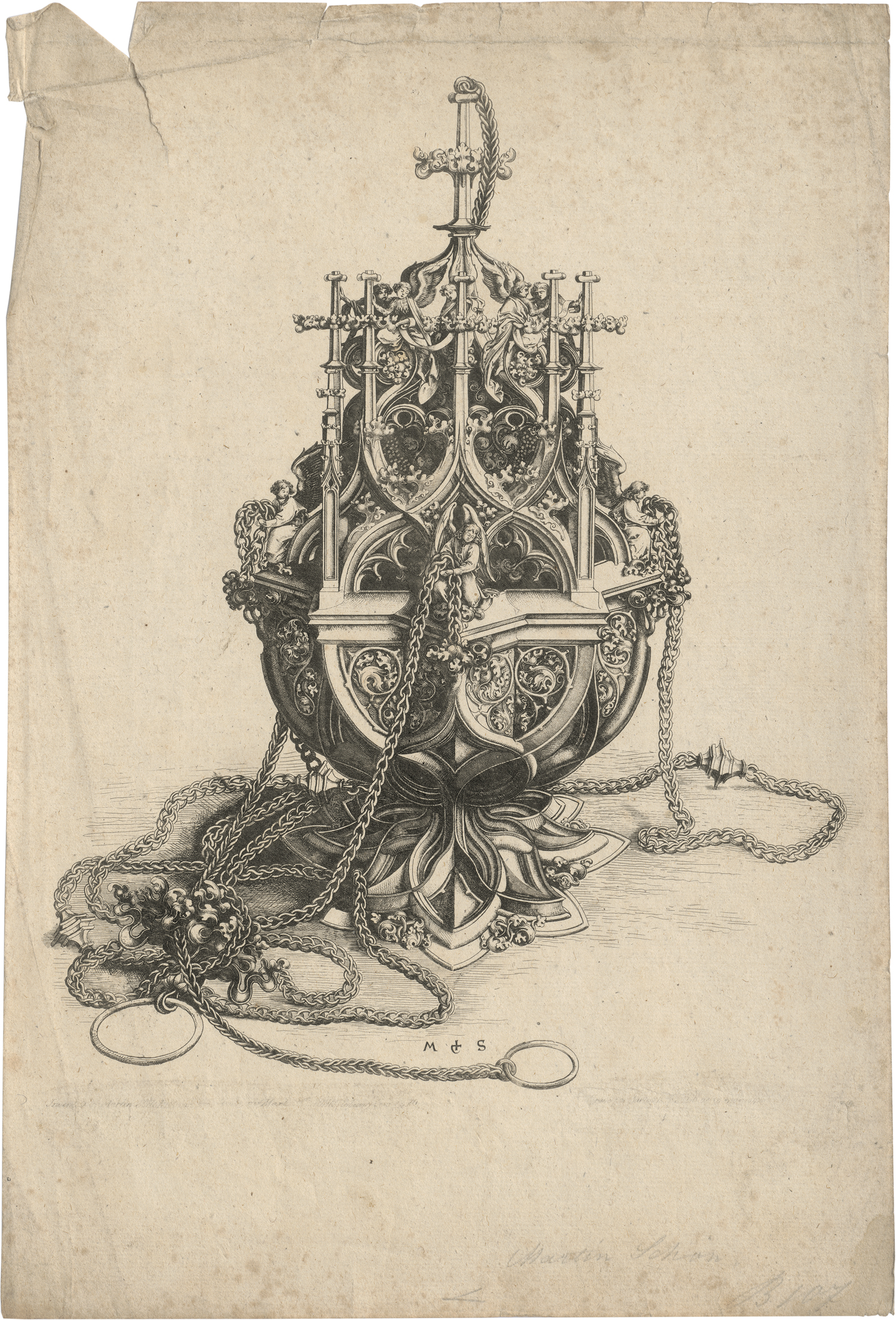 Äußerst versierte und überzeugende Wiederholung nach dem berühmten Vorbild Martin Schongauers im gleichen Sinn. Von rechts beleuchtetes Weihrauchgefäß, aufs Reichste verziert mit Maßwerk, Fialen, krabbenbesetzten Spitzbögen und Kreuzblumen. Auf halber Höhe sind drei Engel sichtbar, welche die Ketten halten. Ausgezeichneter Druck mit feinem und unten mit breiterem Rand. Leicht stockfleckig sowie angestaubt, die Ränder etwas bestoßen und mit Knitter- und Knickspuren, oben links diagonaler Randeinriss, weitere Randläsuren und - einrisse vor allem oben, unterhalb der Darstellung Spuren der getilgten Inschrift, Alters- und Gebrauchsspuren, sonst gut erhalten.