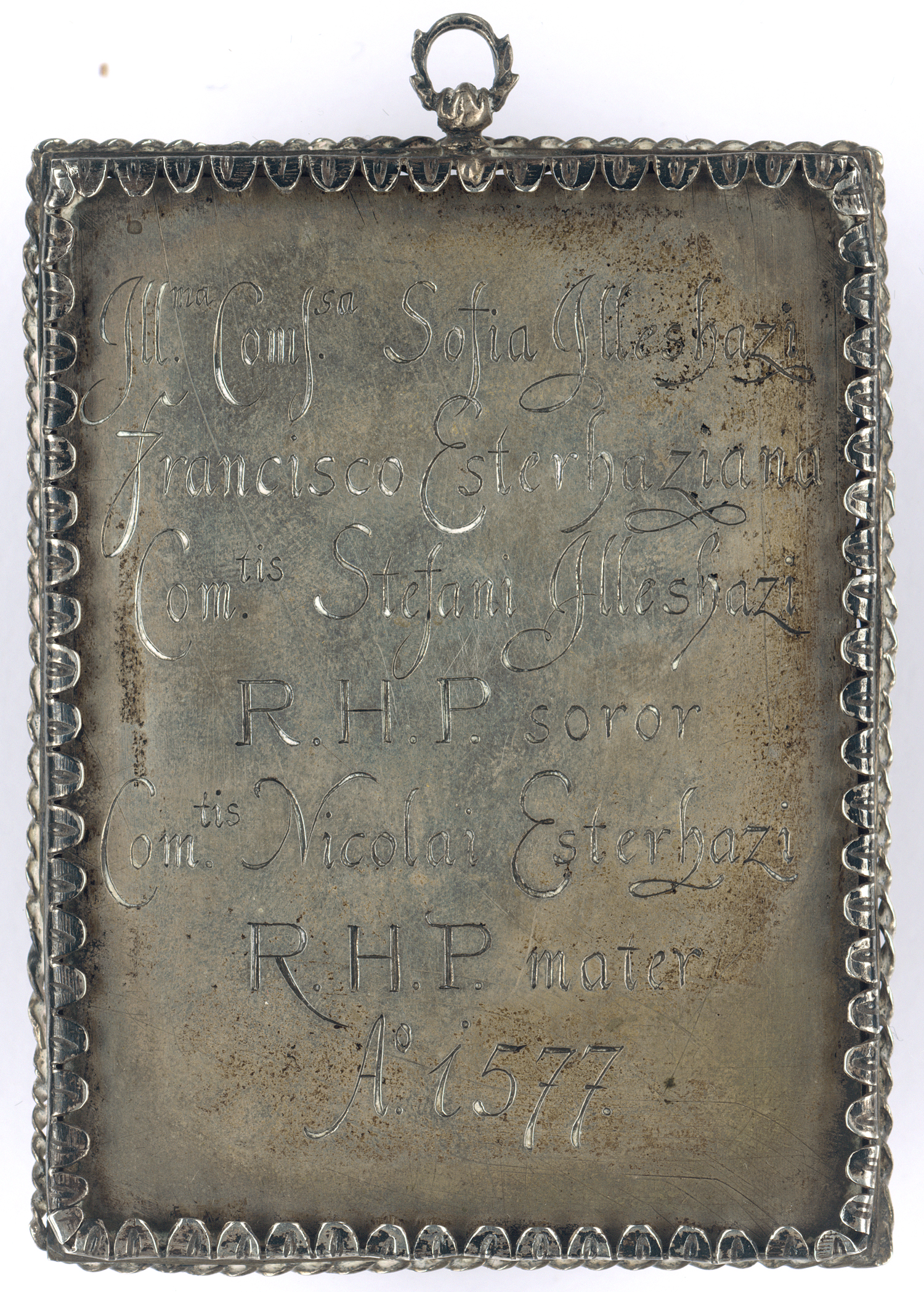 Öl mit Goldhöhungen auf Silber. 7,2 x 5,2 cm. Verso mit gravierter Inschrift "Ill.ma Coms.ss Sofia Illeshazi Francisco Esterhaziana Com.tis Stefani Illeshazi R.H.P. soror Com.tis Nicolai Esterhazi R.H.P. mater Ao 1577".
