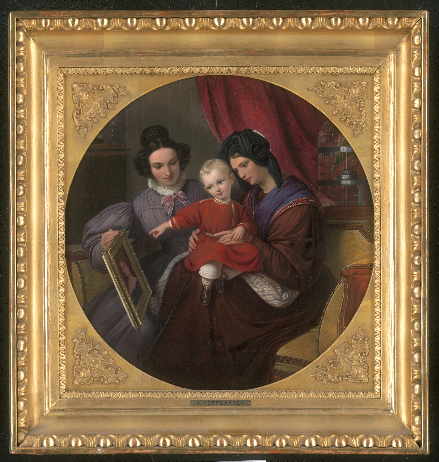 In einem nahansichtig erfassten Interieur sitzen drei Personen auf einem Canapé innig beisammen: Im Mittelpunkt der Komposition ist ein Knabe im roten Kittel, zärtlich umsorgt von zwei Frauen, wahrscheinlich Verwandten, in ausladenden Kleidern. Während die eine ihn auf ihrem Schoß hält, führt ihm die andere das Bildnis einer dritten Frau vor. Um wen es sich bei dieser Figur wohl handelt, die nur indirekt im Bild anwesend sein kann? Vielleicht um eine verstorbene Angehörige, gar die Mutter? Dem Kind scheint ihr Konterfei auf jeden Fall vertraut zu sein, deutet es doch leicht lächelnd mit ausgestrecktem Ärmchen auf sie. Mit wenigen Gesten und Bildelementen wird das klassische Gruppenbildnis so subtil um ein narratives Moment erweitert, das von Verlust und Erinnern erzählt.