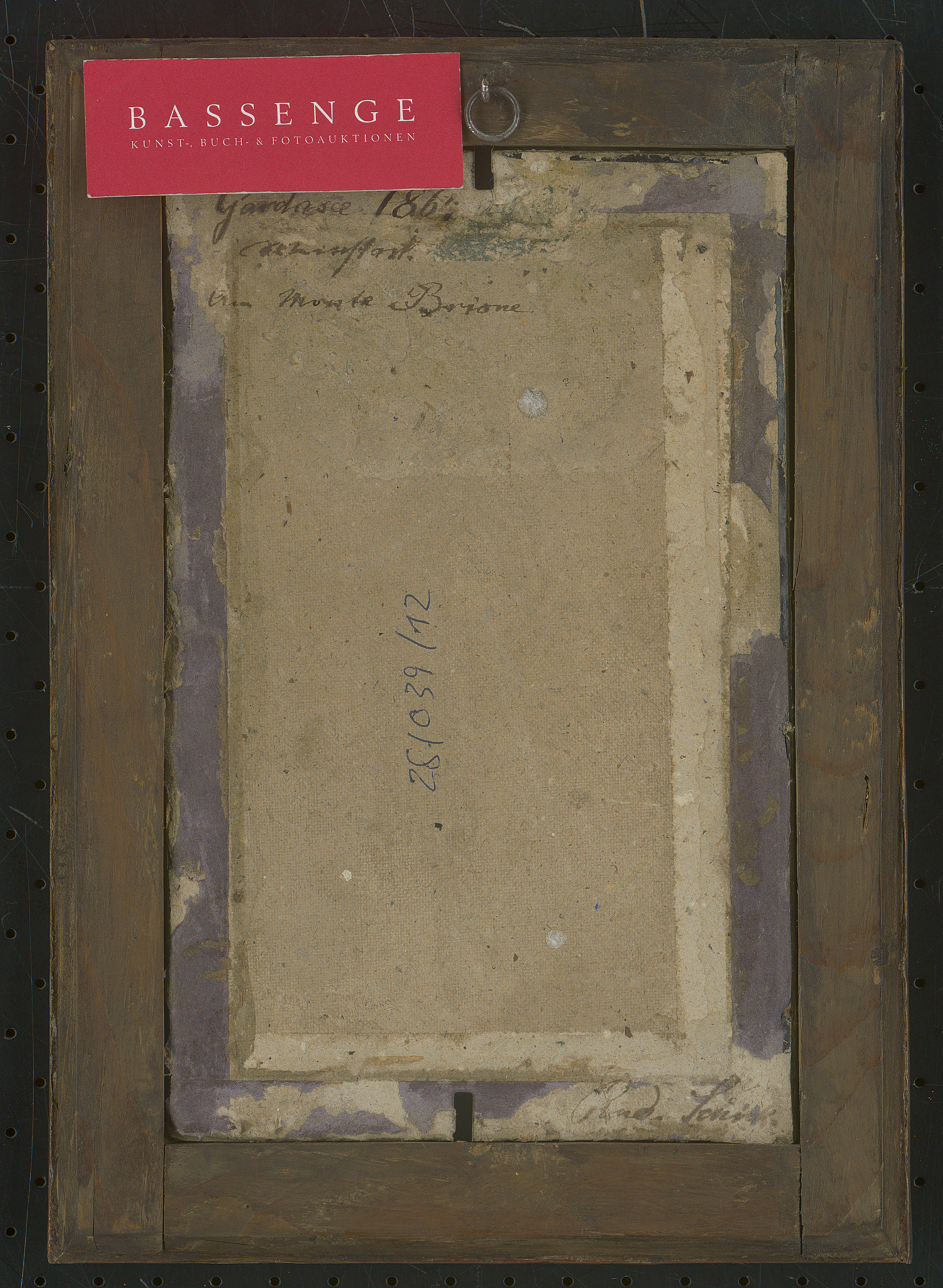 Öl auf Leinwand, auf feste Pappe aufgezogen. 23,8 x 14,9 cm. Verso oben links betitelt und datiert "Gardasee 1864 / Weinstock / am Monte Brione", unten rechts signiert "Rud. Schick".