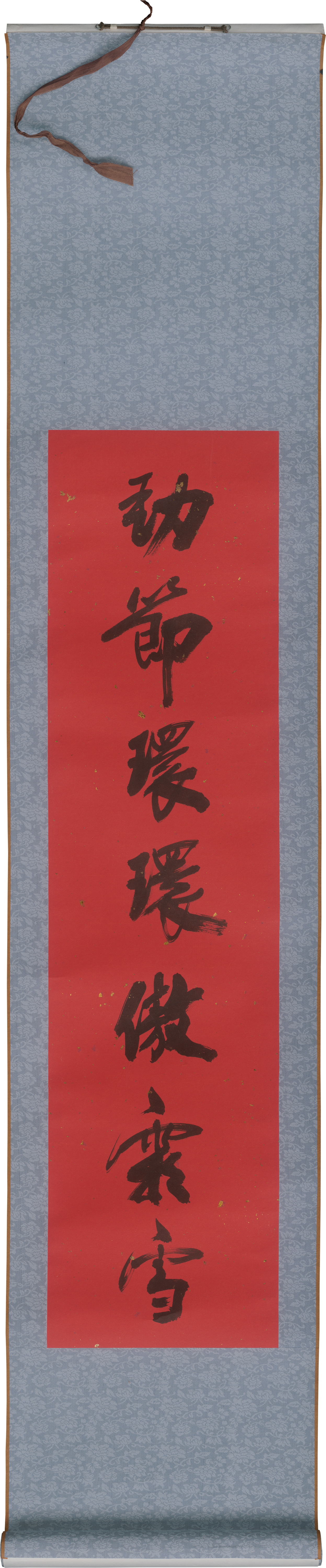 Elegante, dynamisch geführte Kalligraphie mit den Versen: Jìn jié huán ào shuâng xuě ("Starkes Astwerk trotzt Frost und Schnee", erste Rolle) und Cuì yè piàn piàn cháng zhù chûn ("Grüne Blätter überdauern den Frühling", zweite Rolle). Die Zeilen preisen in metaphorischer Form Standhaftigkeit und Beständigkeit des menschlichen Charakters. Der Name des Kalligraphen lautet vermutlich Hua. – In sehr gutem Zustand. Kaum Handhabungsspuren.