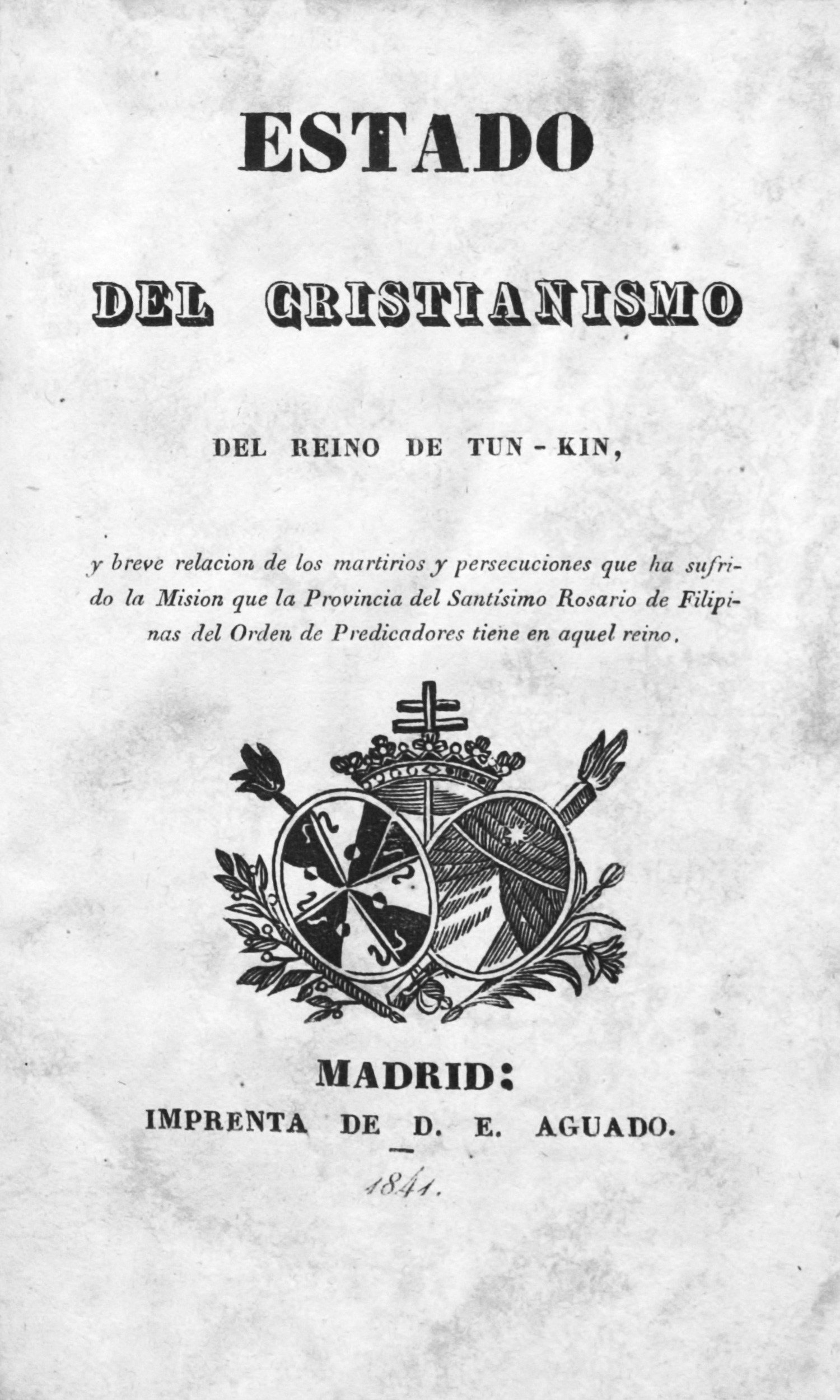 Vietnam. Estado del cristinismo del reino de Tun-Kin. 139 S. Mit Holzschnittvignette auf dem Titel. 15 x 9,5 cm. Leder d. Z. (berieben) mit goldgeprägtem RSchild. Madrid, D. E. Aguado, 1841.