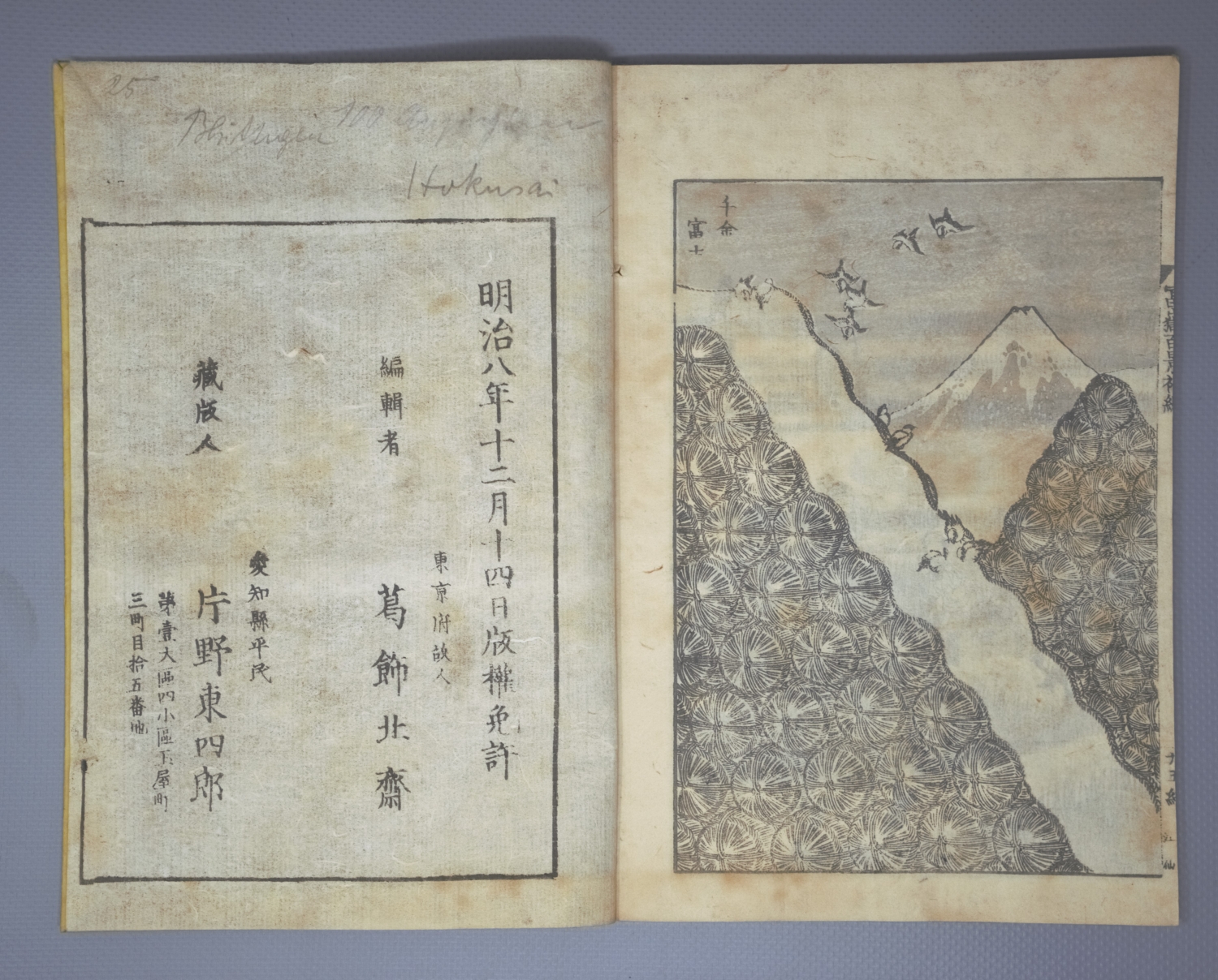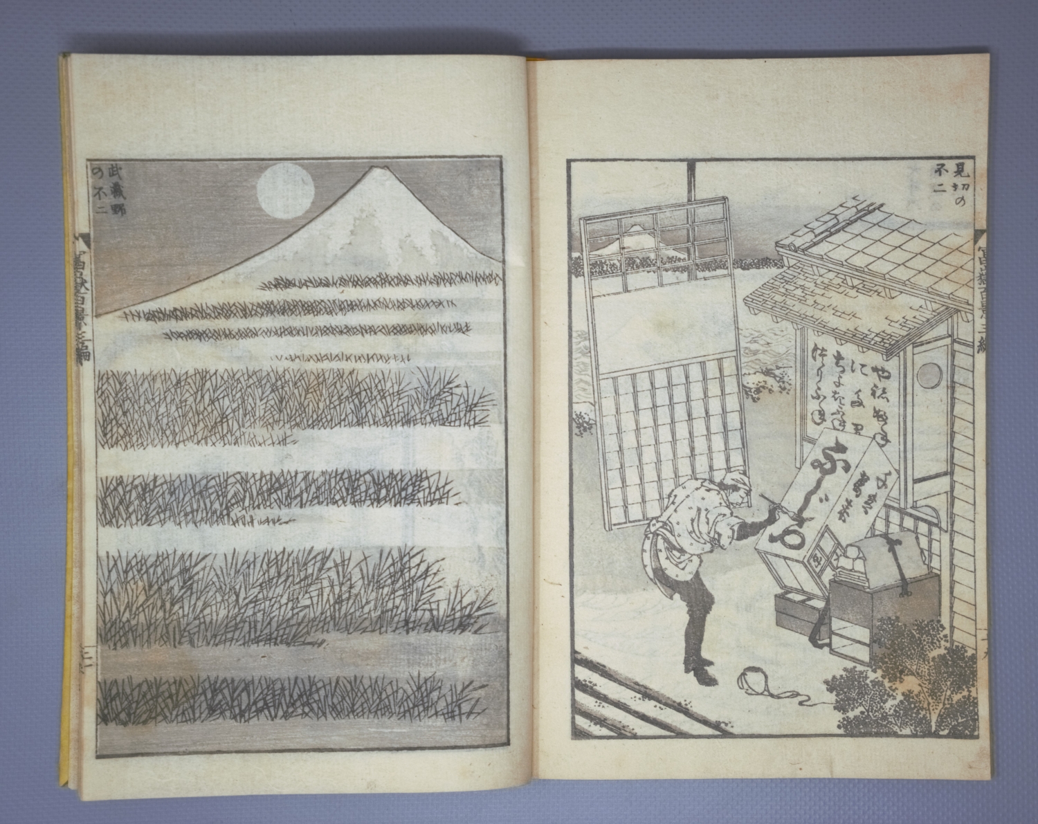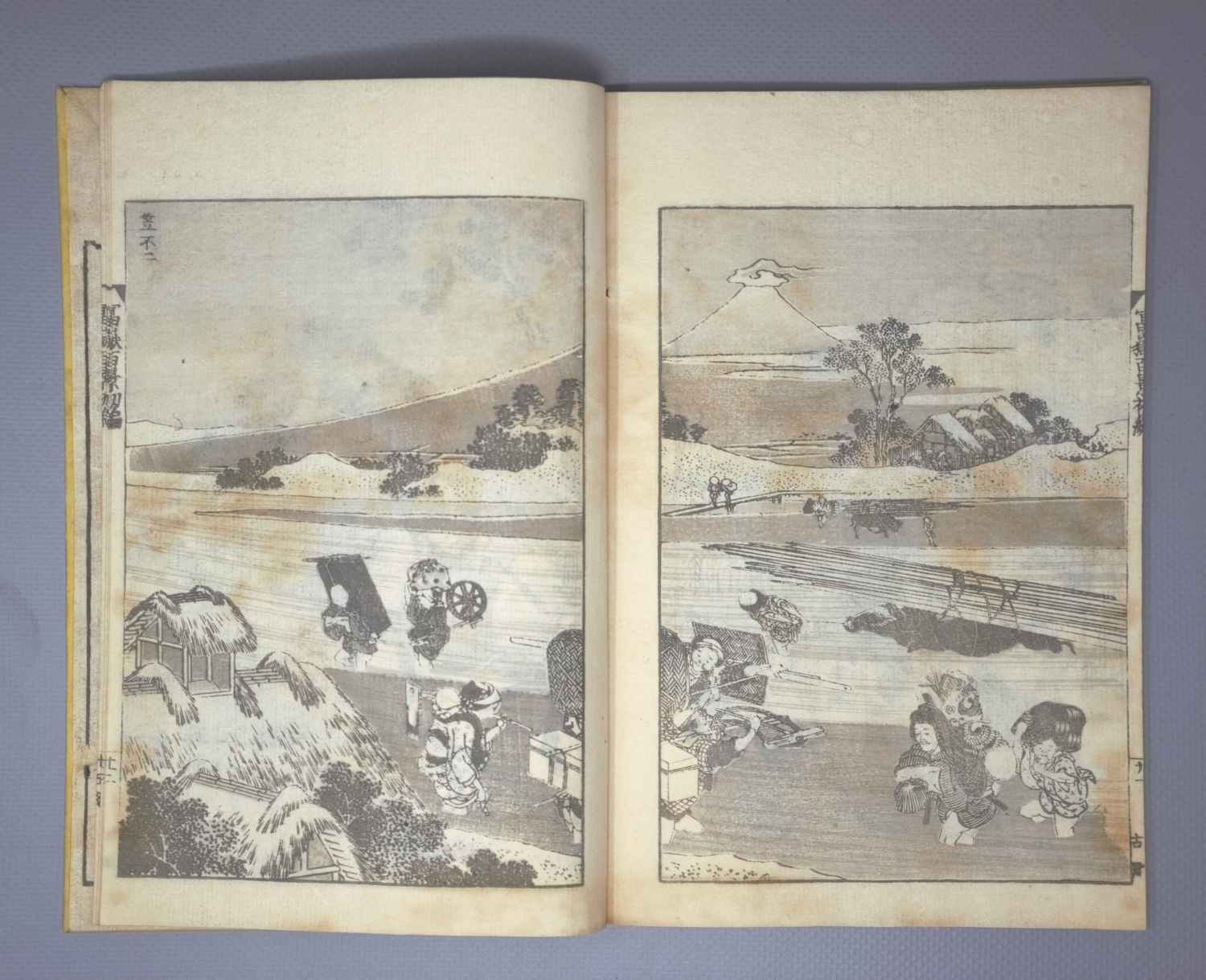 Hokusai, Katsushika. Fugaku hyakkei (japonice: 100 Ansichten des Berges Fuji). 3 Ehon Bände. Mit 100 Holzschnitten (davon 44 doppelblattgr. und 56 blattgr.). 22,5 x 14,5 cm. Als Blockbücher gebunden mit weißer Fadenheftung in flexiblen gelben Broschurdeckeln d. Z. (diese leicht fleckig und angeschmutzt), zusammen im modernem Buntpapier-Pappschuber. Edo wohl spätere posthume Ausgabe um 1875.