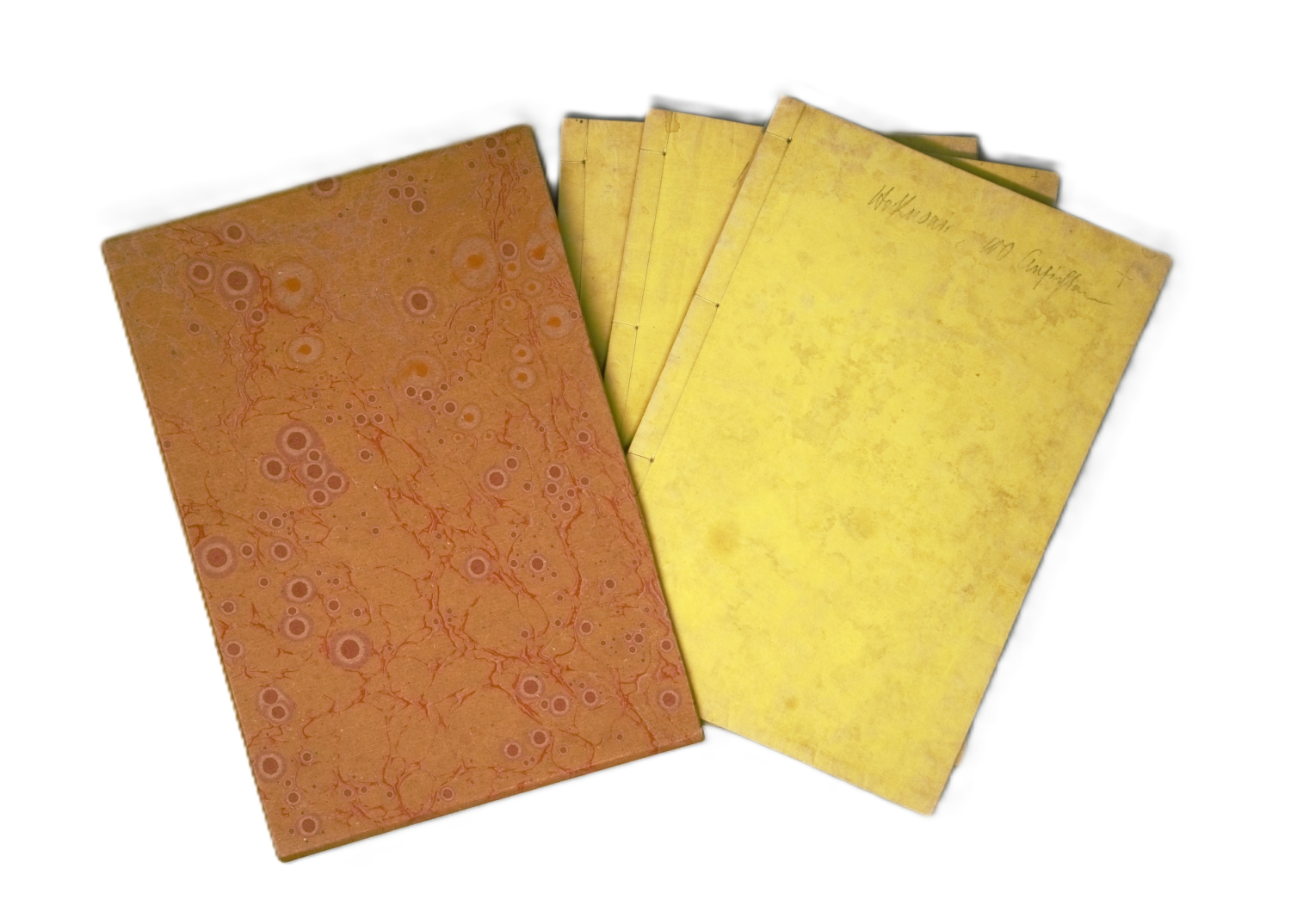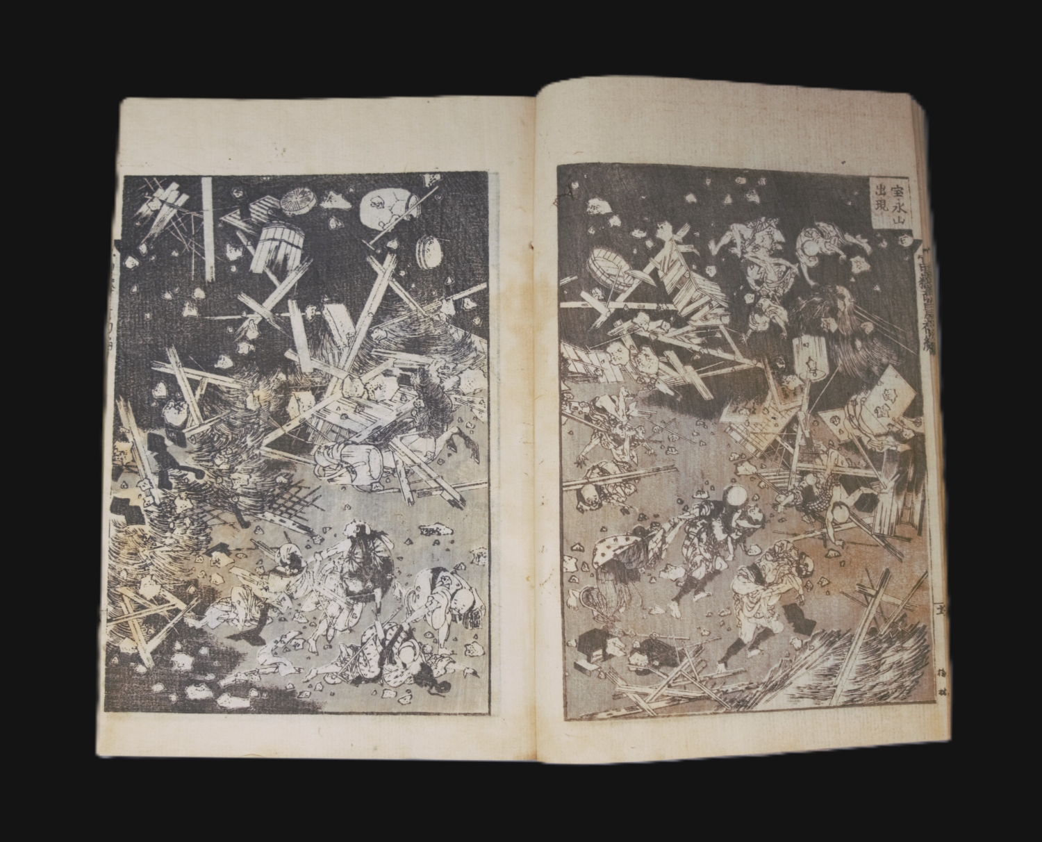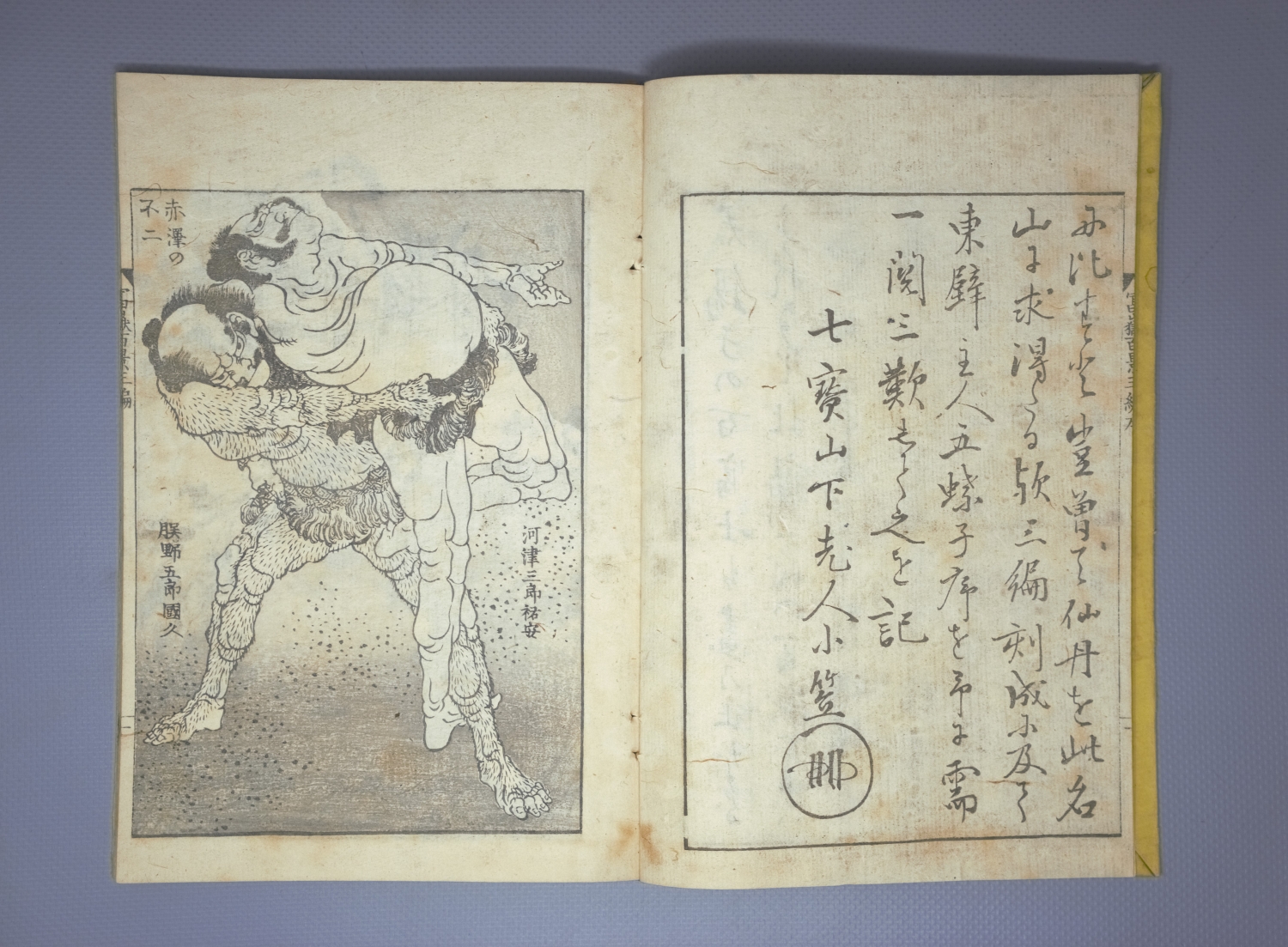 Hokusai, Katsushika. Fugaku hyakkei (japonice: 100 Ansichten des Berges Fuji). 3 Ehon Bände. Mit 100 Holzschnitten (davon 44 doppelblattgr. und 56 blattgr.). 22,5 x 14,5 cm. Als Blockbücher gebunden mit weißer Fadenheftung in flexiblen gelben Broschurdeckeln d. Z. (diese leicht fleckig und angeschmutzt), zusammen im modernem Buntpapier-Pappschuber. Edo wohl spätere posthume Ausgabe um 1875.