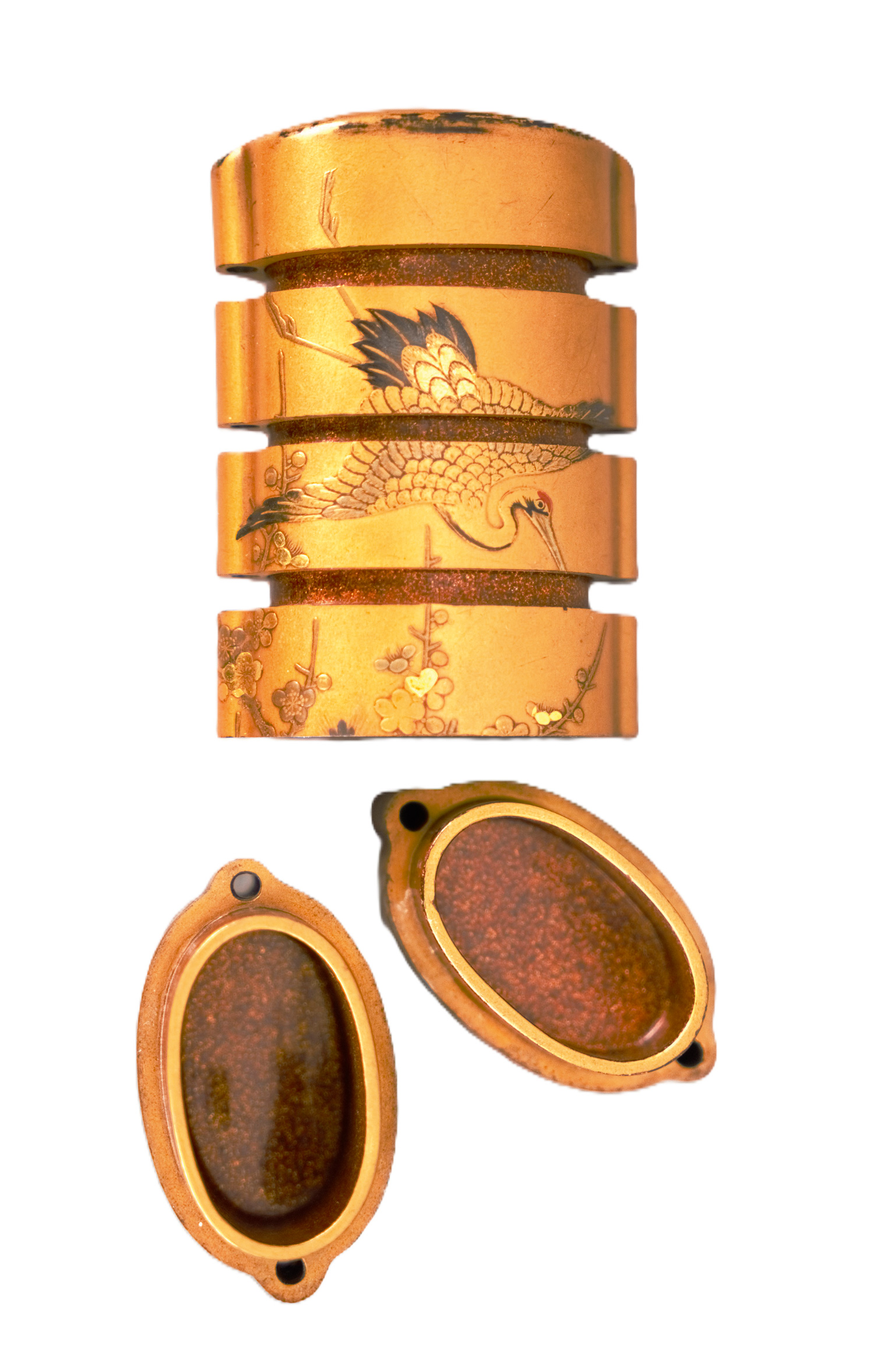 Während die ursprüngliche Funktionalität im Laufe der Edo- und Meiji-Zeit zunehmend in den Hintergrund trat, entwickelte sich das Inrô zu einem Objekt höchster Kunstfertigkeit und zu begehrten Sammlerstücken. Als Statussymbol und representatives Schmuckaccessoir wohlhabender Kaufleute und des Samurai-Standes wurden diese Behältnisse zu aufwendig dekorierten kleinen Kunstwerken, veredelt mit Techniken wie Maki-e (Goldstaublack), Raden (Perlmutteinlage) oder filigranen Gravuren. – Keine Fadenkordel. Blattgold und Lack, insbesondere an den Kanten, etwas abgeplatzt. Kanten berieben, Lack etwas abgeplatzt.