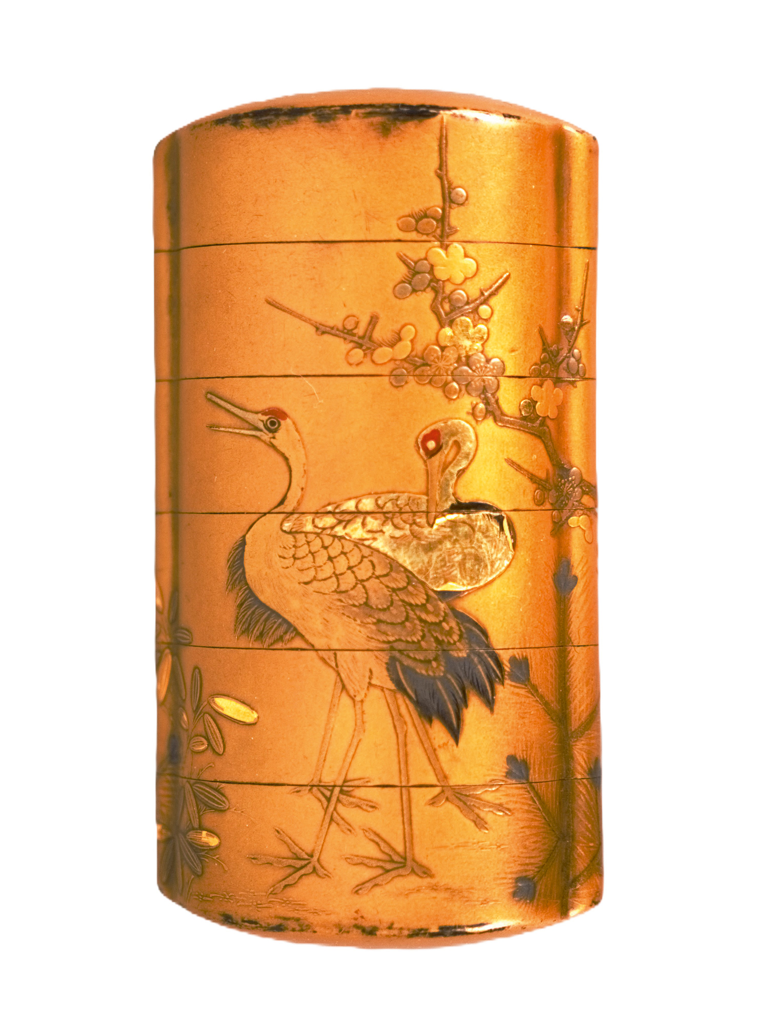 Von einer Seite zeigt das Inrô zwei stattliche Mandschurenkraniche mit leuchtend roten Fleck auf dem Kopf, aufrecht stehend zwischen stilisierten Pflaumenbaumästen und Kiefernzweigen. Die andere Seite zeigt einen dritten Kranich im Anflug mit weit ausgebreiteten Flügeln. Die Signatur und die rote Hanko-Siegelmarke weisen auf einen Künstler aus einer vielverzweigten Familie hin, die bekannt war für höchste Qualität im Herstellen von Inrô und Netsuke.