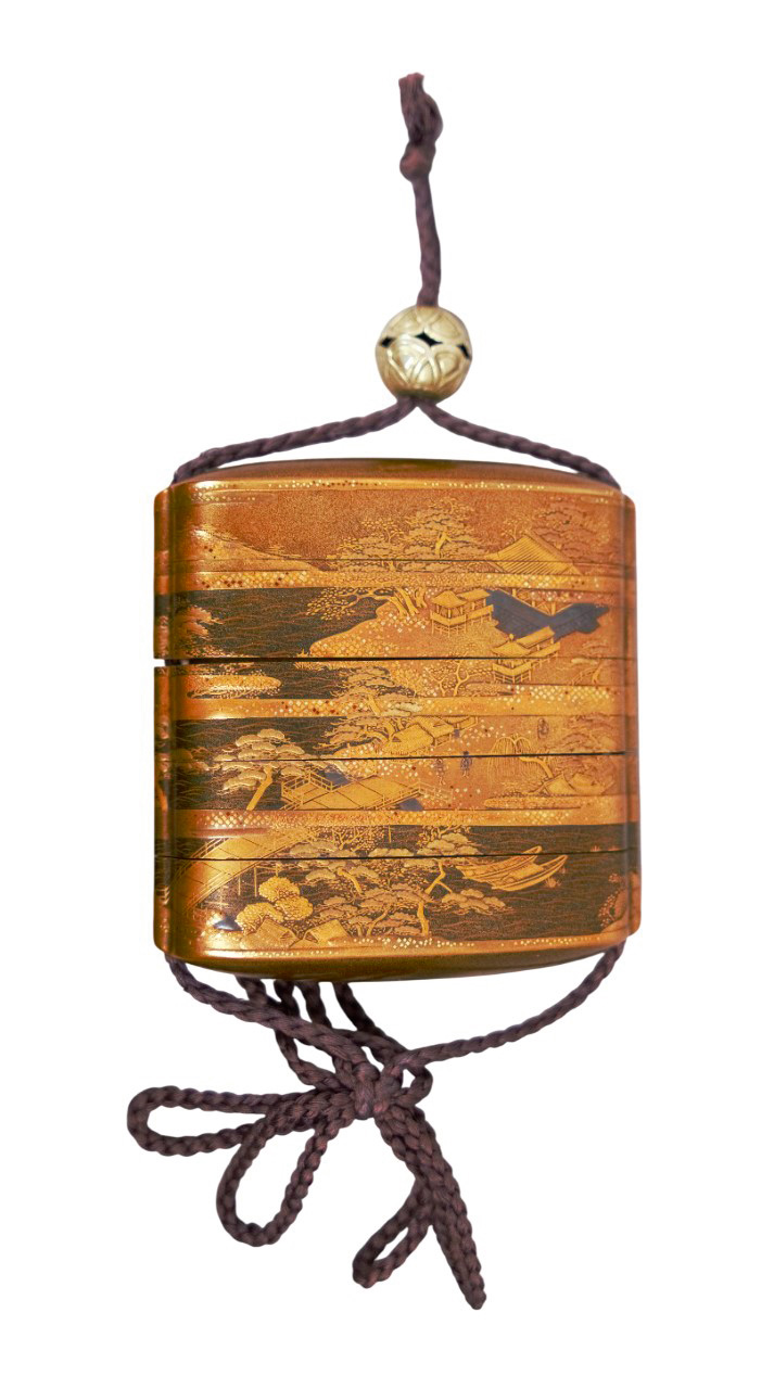 Inrô mit Seelandschaft-Hiramakie. 5-teiliges Aufbewahrungs-Behältnis, unten signiert "Kajikawa Bunryusai". Holzgefäß mit Kinji-Goldlackgrund und Gold-Hiramakie, darstellend eine Seenlandschaft. Innen Nashiji-Streulack in Kupfer. 8,5 x 8,5 x 2,5 cm. Mit bräunlicher Flecht-Kordel sowie mit Schmuckperle. Japan, Meiji-Zeit, 19. Jahrhundert.