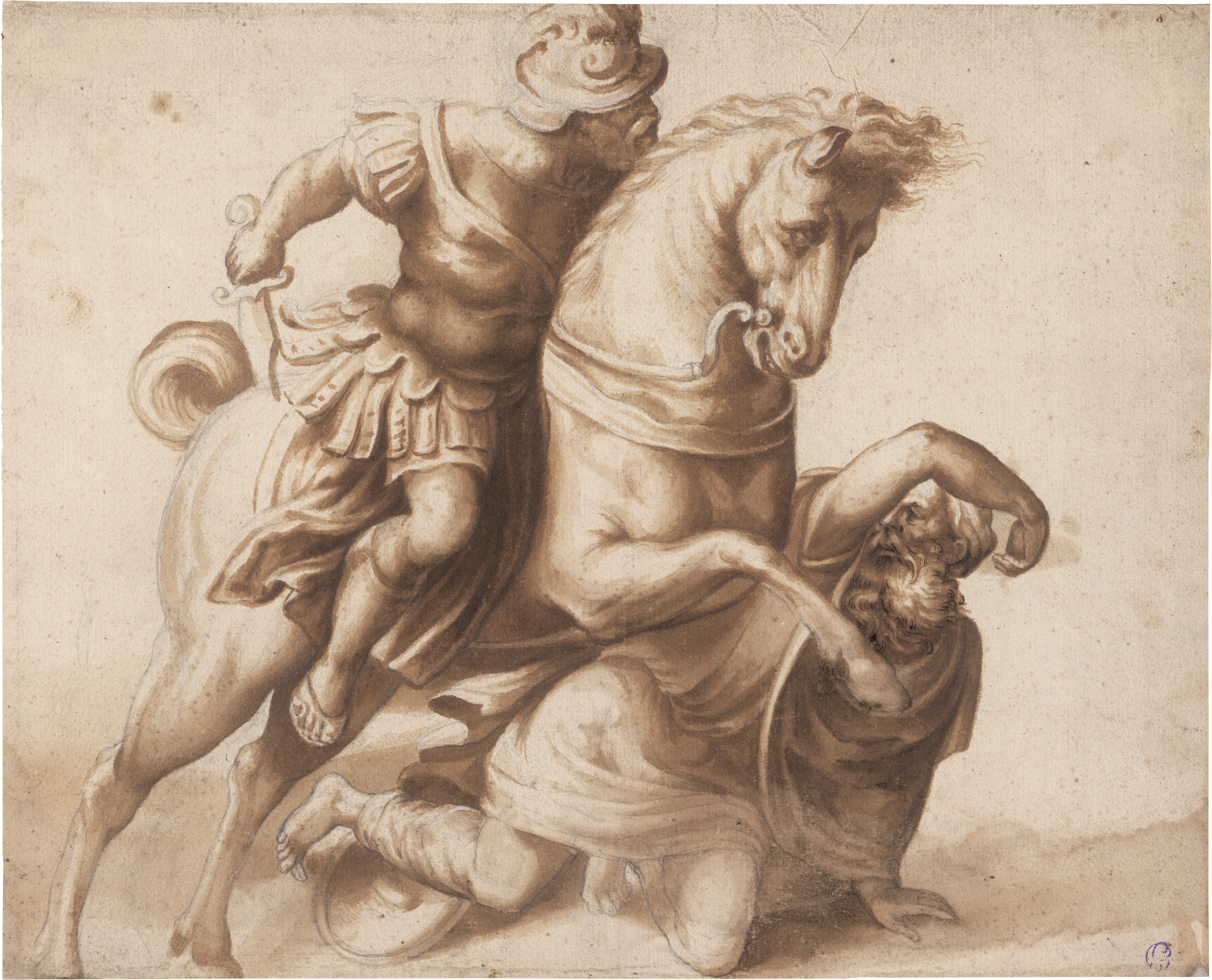 Pinsel in Braun über Graphit, auf Papier des 18. Jh. kaschiert, an den oberen Ecken montiert. 28,2 x 34,8 cm.