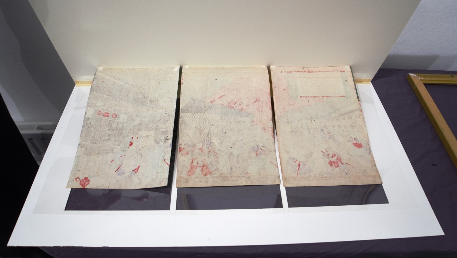 Kuniteru, Utagawa. Die Brandstiftung in der Residenz von Satsuma. 3 Ukiyo-e Farbholzschnitte im Triptychon aus der Serie "Eine kurze Geschichte der Neuzeit". Format ôban tate-e. 1 Blatt: 35 x 23 cm. Mit Passepartout in Holzprofilleiste. Edo (Tokio) um 1870.