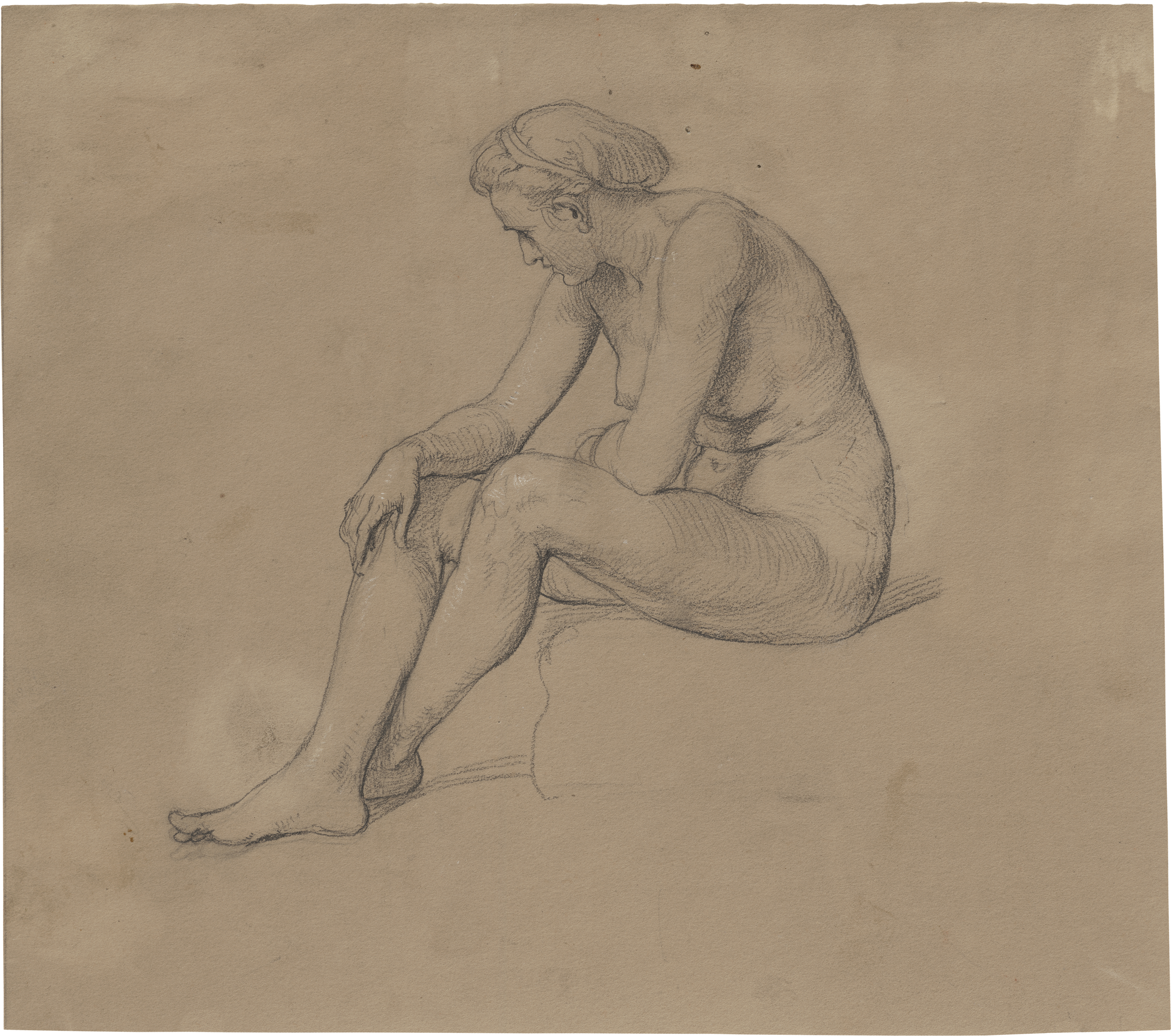 Bleistift, weiß gehöht, auf bräunlichem Velin, entlang des Oberrandes montiert. 20,5 x 23,3 cm.