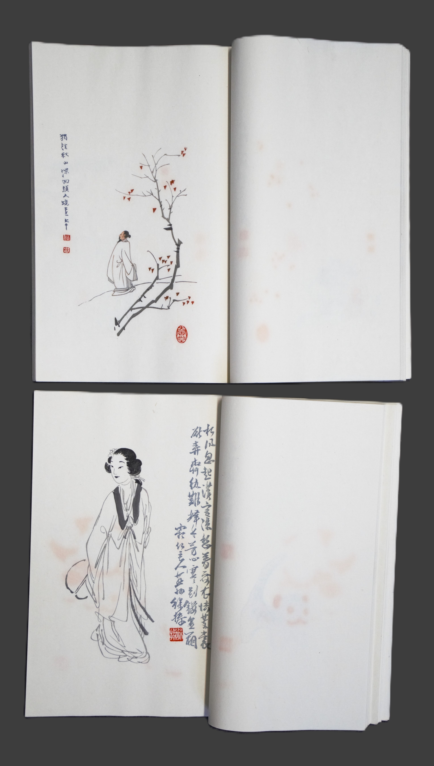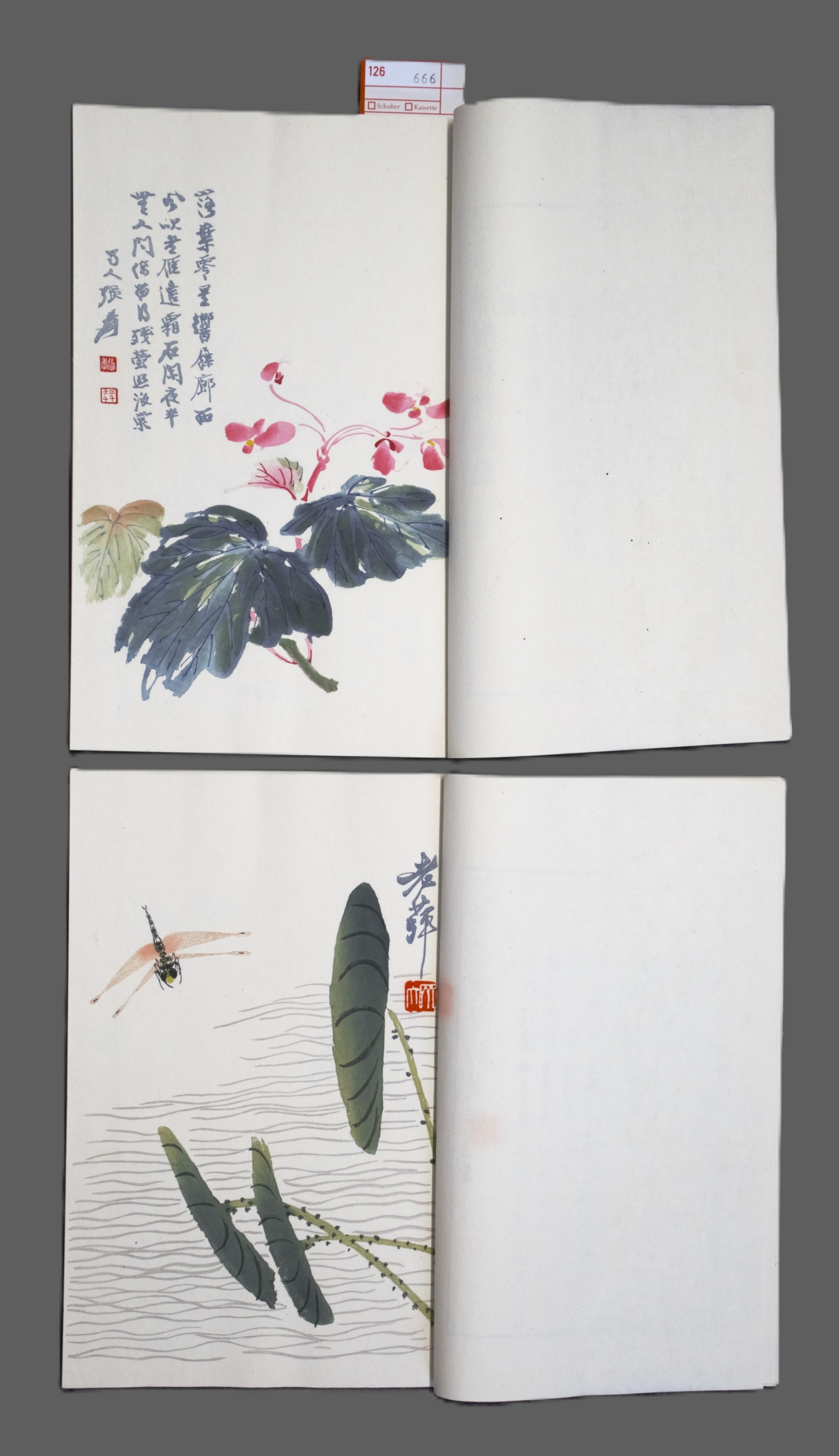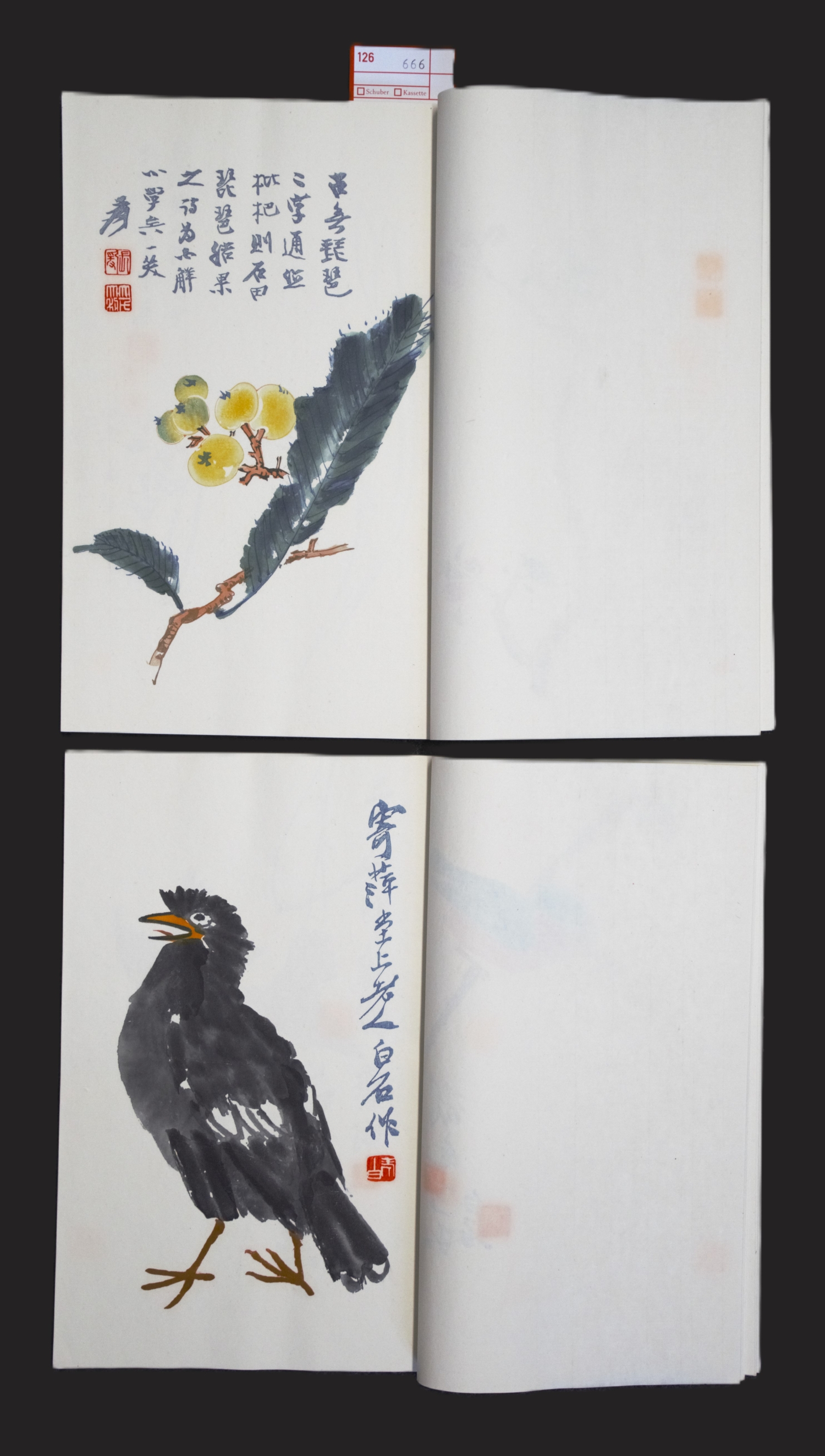 Die Farbholzschnitte nach Qi Baishi (1864-1957), einem der wichtigsten Maler der chinesischen Moderne. Bekannt wurde er besonders für Darstellungen von Vögeln, Insekten, Blumen und Kleintieren. Sein Stil verbindet expressive Reduktion mit klar geführtem, ökonomischem Pinselduktus. Neben seiner malerischen Tätigkeit widmete er sich der Dichtung, die er häufig als Ergänzung oder Kommentar seinen Bildern beigab. – Gelegentlich mit Durschlag der Stempel, und leicht fleckig. Insgesamt sehr sauber und in sehr gutem Erhaltungszustand.