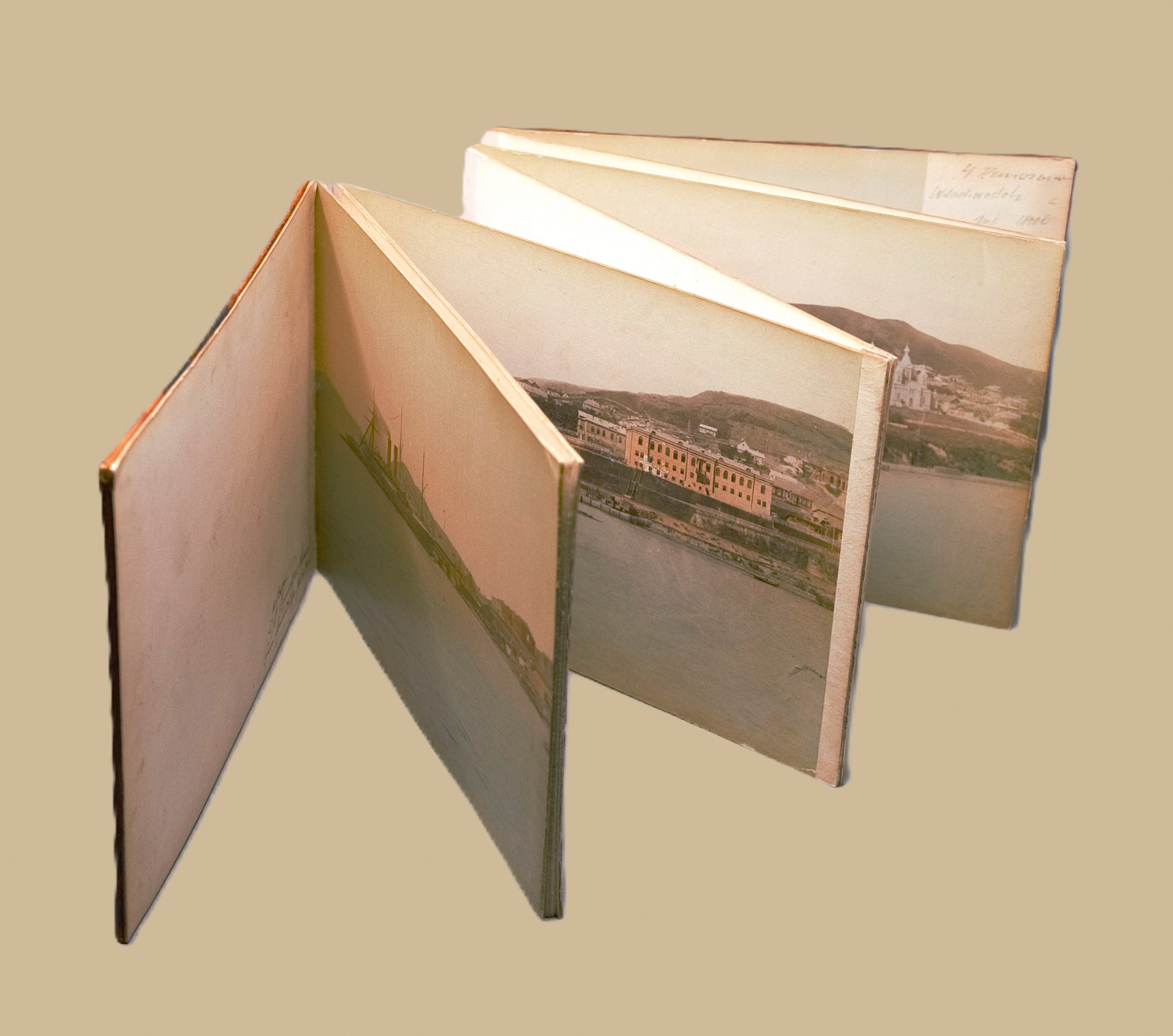 Wladiwostok. Leporello aus 7 kolorierten Fotografien. 18 x 208 cm. Leder d. Z. (berieben und bestoßen) mit einem blindgeprägten, kolorierten und goldgeprägten Fächermotiv auf den Deckeln. Wladiwostok um 1930.