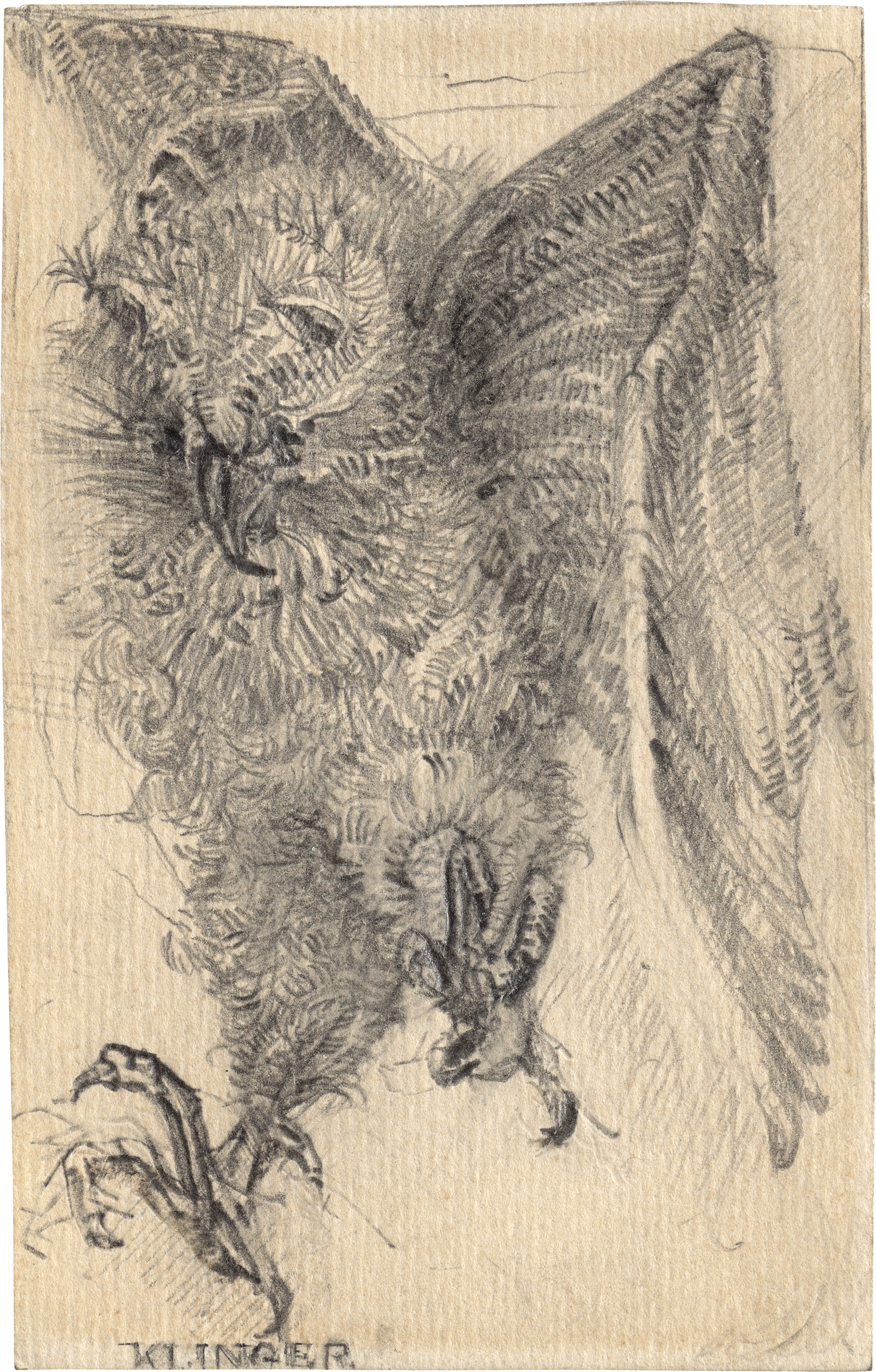 Expressive Zeichnung, die in ihrem kraftvollen Ausdruck den Raubvogel mit seinem weichem Gefieder detailreich erfasst.