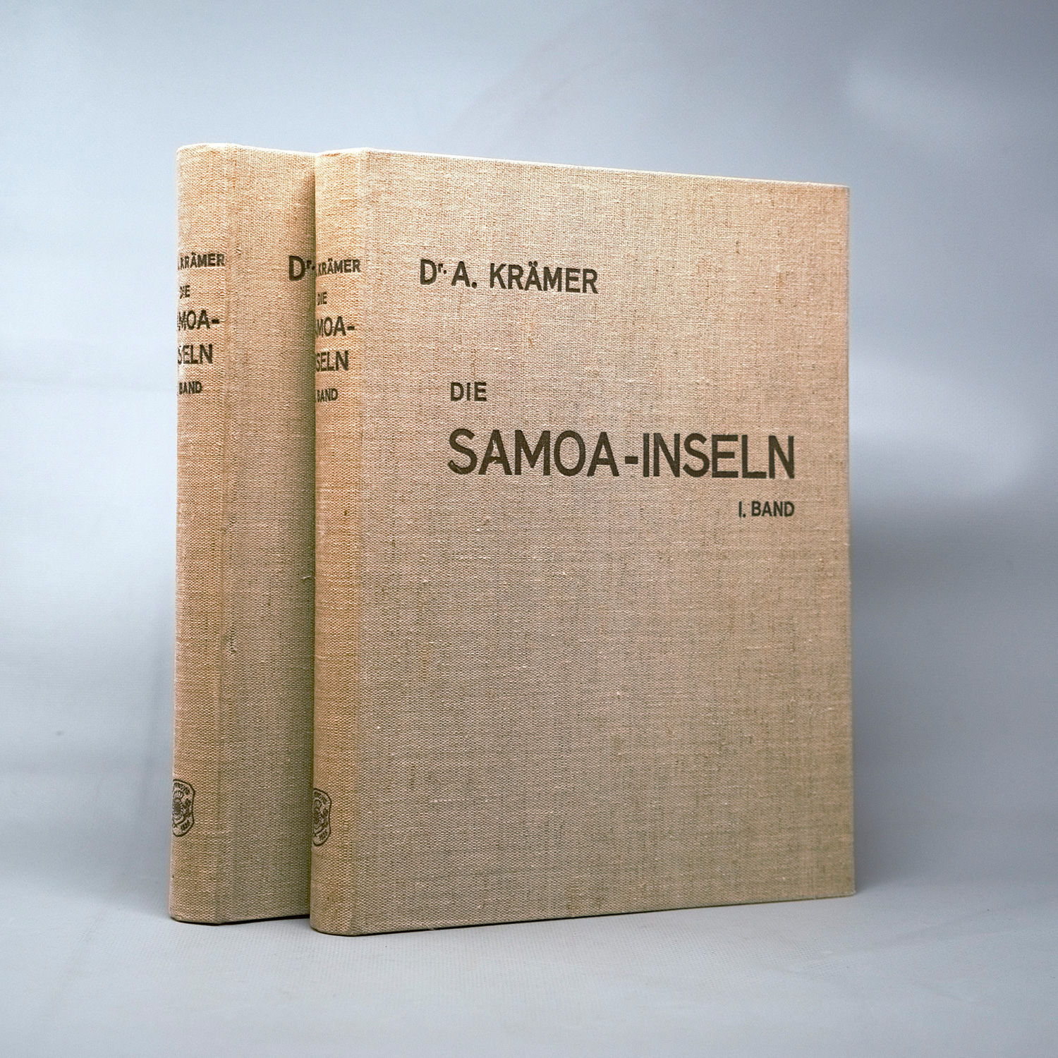 Krämer, Augustin. Die Samoa-Inseln. Entwurf einer Monographie mit besonderer Berücksichtigung Deutsch-Samoas. [und Anhang: Die wichtigsten Hautkrankheiten der Südsee]. 3 Teile in 2 Bänden. Mit 18 Tafeln sowie 4 Karten und 192 Textabbildungen. 30 x 22,5 cm. OLeinen mit Rücken- und Deckeltitel. Stuttgart, Schweizerbart, 1902-1903.
