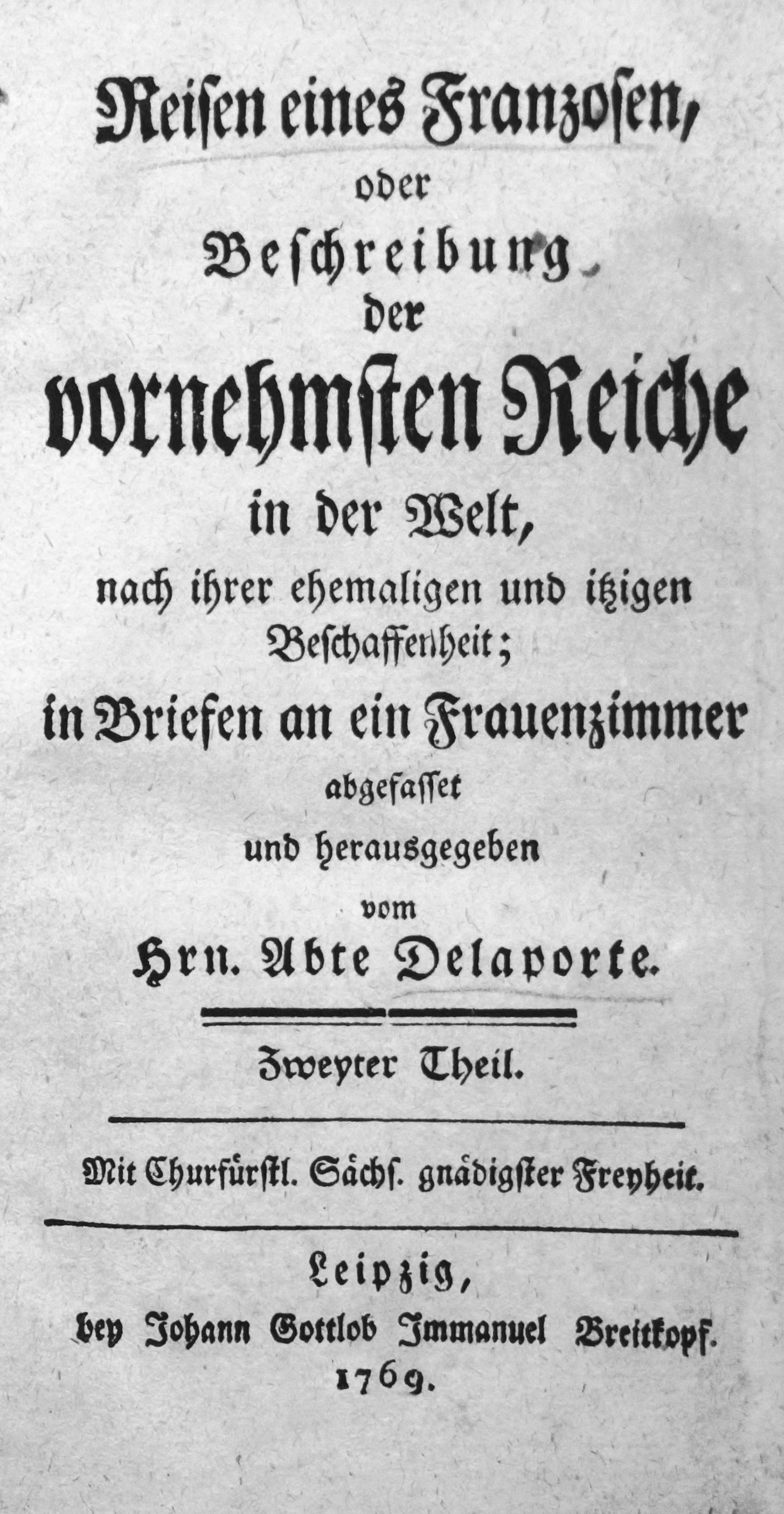 Delaporte, (Joseph). Reisen eines Franzosen, oder Beschreibung der vornehmsten Reiche in der Welt, nach ihrer ehemaligen und itzigen Beschaffenheit; in Briefen an ein Frauenzimmer abgefasset. 27 (statt 36) Bände. 15 x 9 cm. Spätere Halbleinenbände (berieben) mit RSchild und hs. Signaturenschild. Leipzig, Breitkopf, 1769-1785.