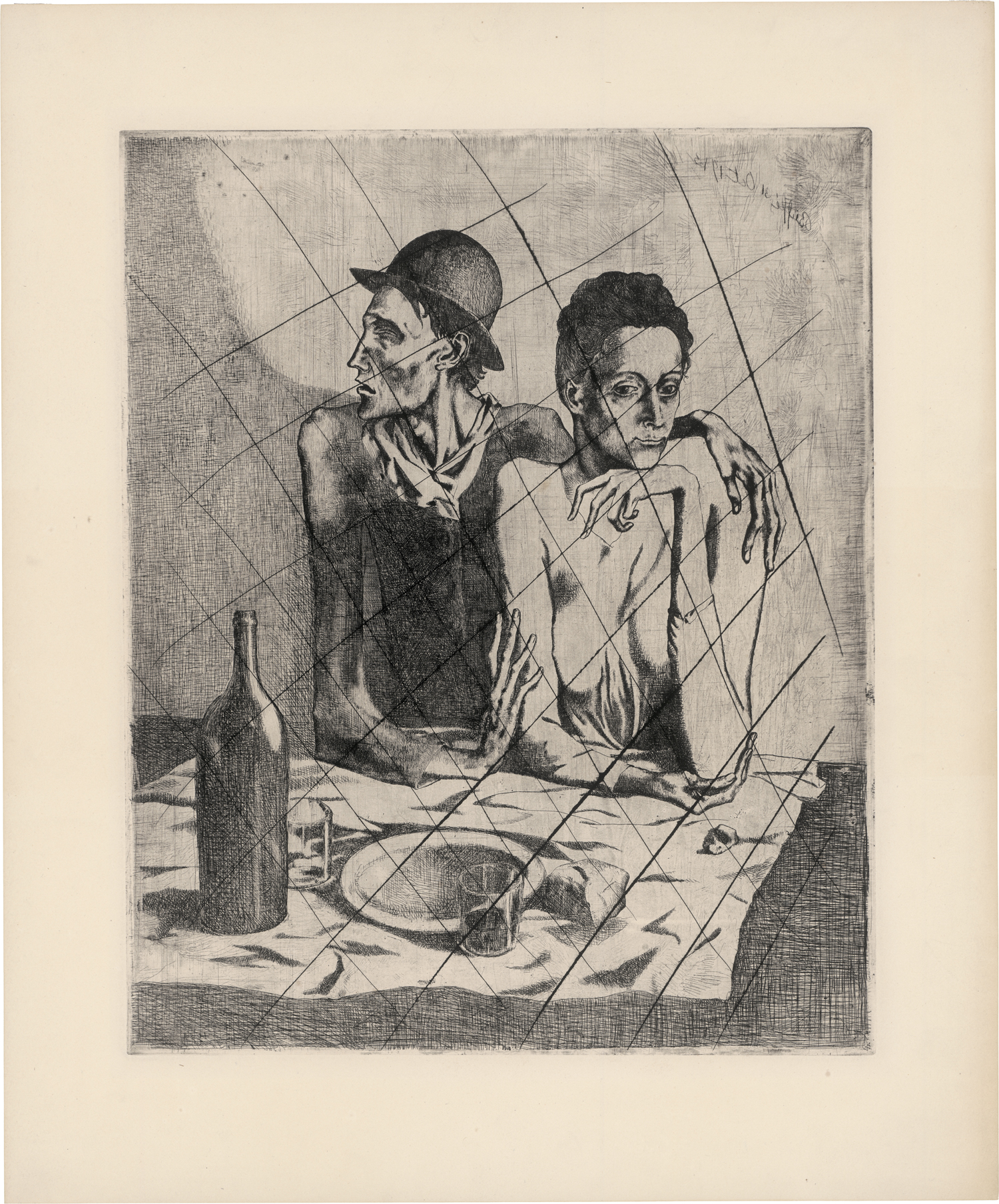 Die frühe, zweite Radierung des erst 23-jährigen Picasso und zugleich seine einzige Druckgraphik der Blauen Periode. Stilistisch zeigt sich diese Phase in einer melancholischen Grundstimmung des Blattes, dem Sujet der Armut und einer manieristisch erscheinenden Darstellung der Körper, Hände und Gestik. Feine Linien und Schraffuren schildern die Nuancen von Licht und Schatten und betonen die eingefallenen Gesichter und hageren Körper des Paares. Der Künstler nutzte hier eine alte Zinkplatte seines Mitbewohners im Atelier Bateau Lavoir in Paris, Joan Gonzáles. Dafür schliff Picasso dessen frühere Landschaftskomposition ab, doch sind noch immer im Hintergrund, vor allem hinter Kopf und Schulter der Frau, Reste der vorigen Radierung in Form einiger schwebender Grasbüschel sichtbar. Aus der Suite der Saltimbanques, dieser Abzug gedruckt 1913 bei Louis Fort, Paris, von der gestrichenen verzinkten Platte, mit der spiegelverkehrten Datierung "31. Oct. 1913" in der Platte. Ganz ausgezeichneter Druck mit breitem Rand.