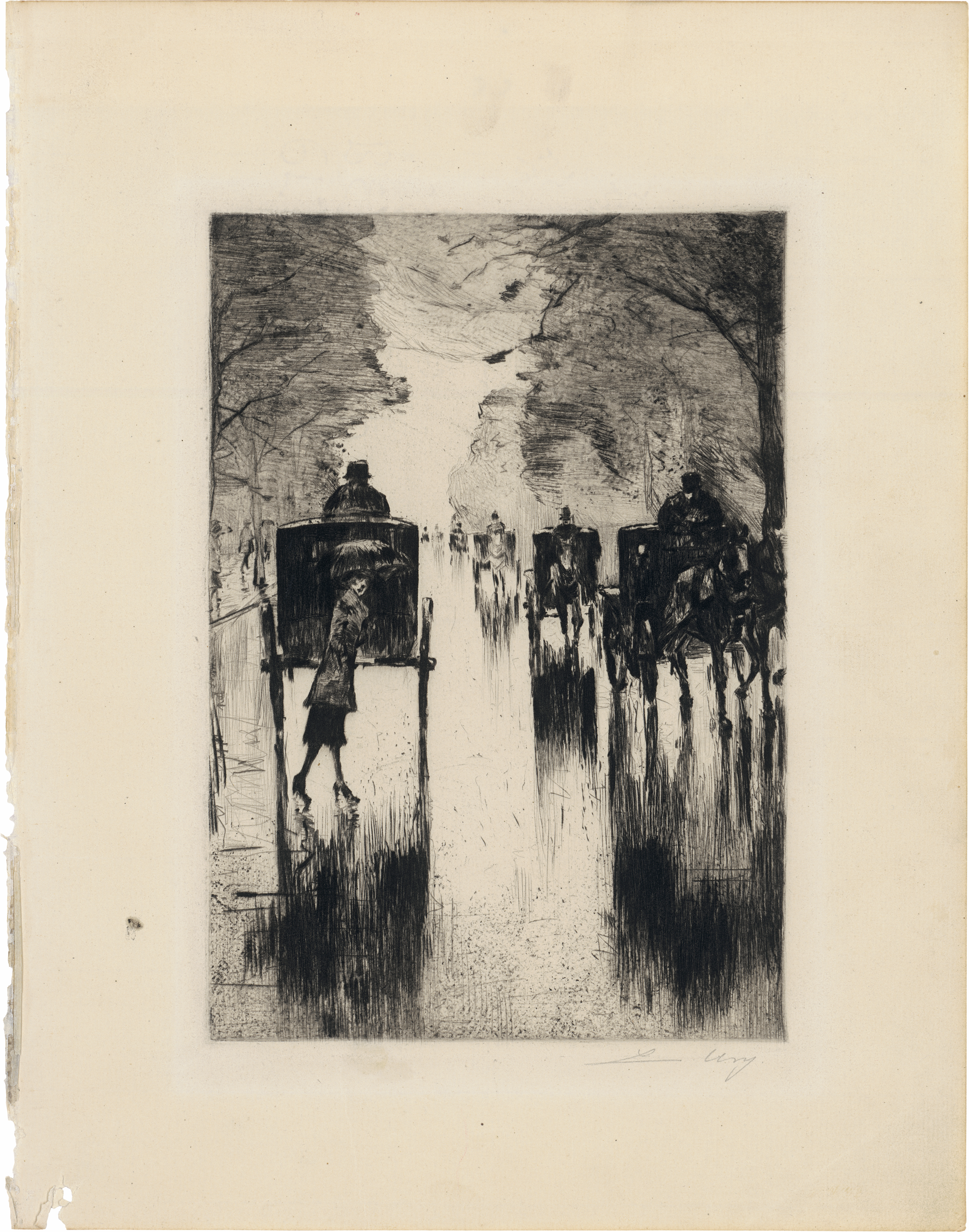 Aus der Werkgruppe III - Berliner Straßenszenen. Eines von 110 Exemplaren der Auflage ursprünglich eingebunden in die Vorzugsausgabe der Monographie von Adolph Donath, "Lesser Ury. Seine Stellung in der modernen deutschen Malerei", erschienen im Verlag Max Perl, Berlin. Prachtvoller Abzug mit feinem Grat und breitem Rand.