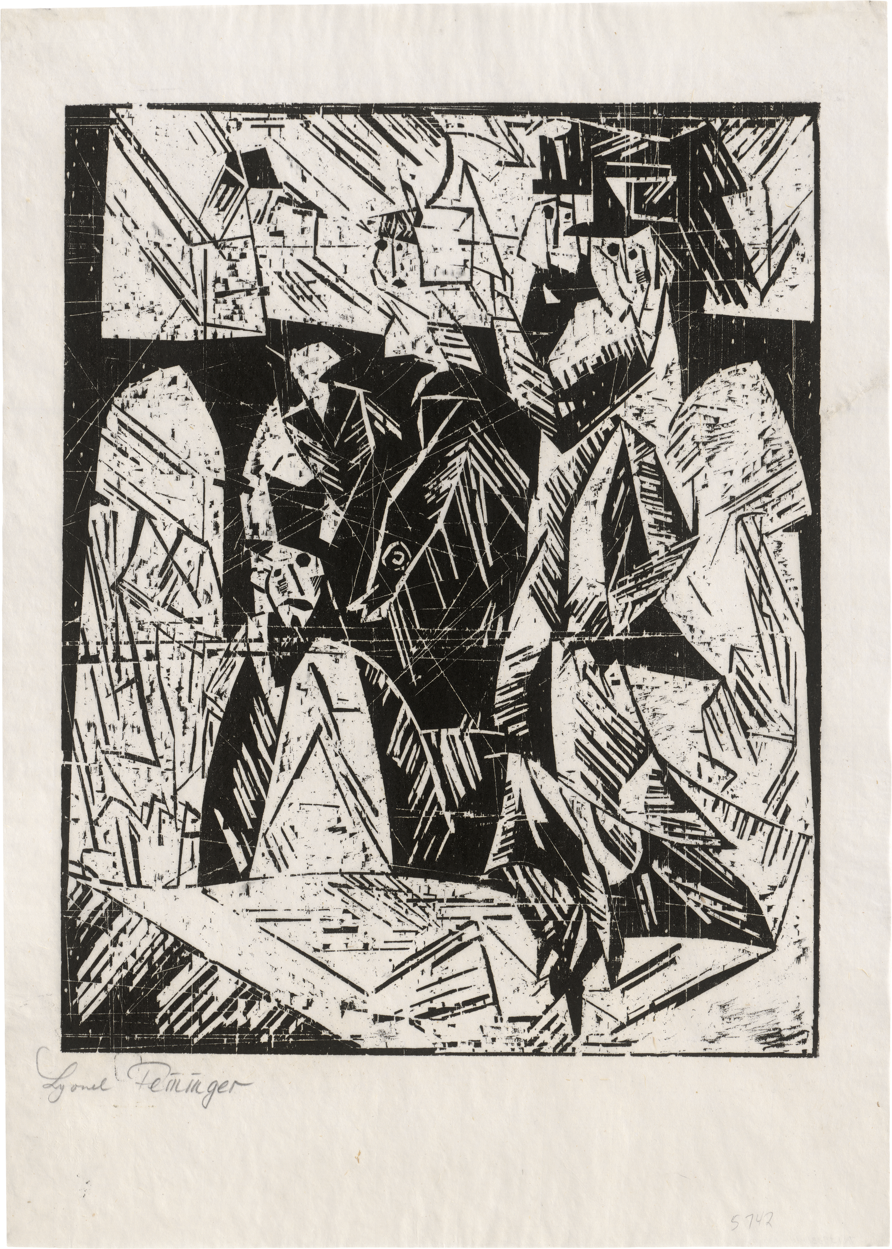 Blatt 2 der Ersten Bauhausmappe: Bauhaus Drucke. Neue europäische Graphik. Erste Mappe. Meister des Staatlichen Bauhauses in Weimar, Verlag Müller & Co., Potsdam 1921. Unten links mit dem Blindstempel des Bauhauses (Lugt 2558b). Schemenhaft wie Gespenster erscheinen die Figuren in der kristallinen, in kleine Splitter zerfallenden und kontrastreichen Komposition, die auf Feiningers Anfänge als Karikaturist verweist. Gedruckt in der Druckerei des Staatlichen Bauhauses. Die Gesamtauflage betrug 130 Exemplare. Prachtvoller, tiefdunkler Handdruck mit der wunderbar sichtbaren Struktur des Holzstockes und mit Rand.
