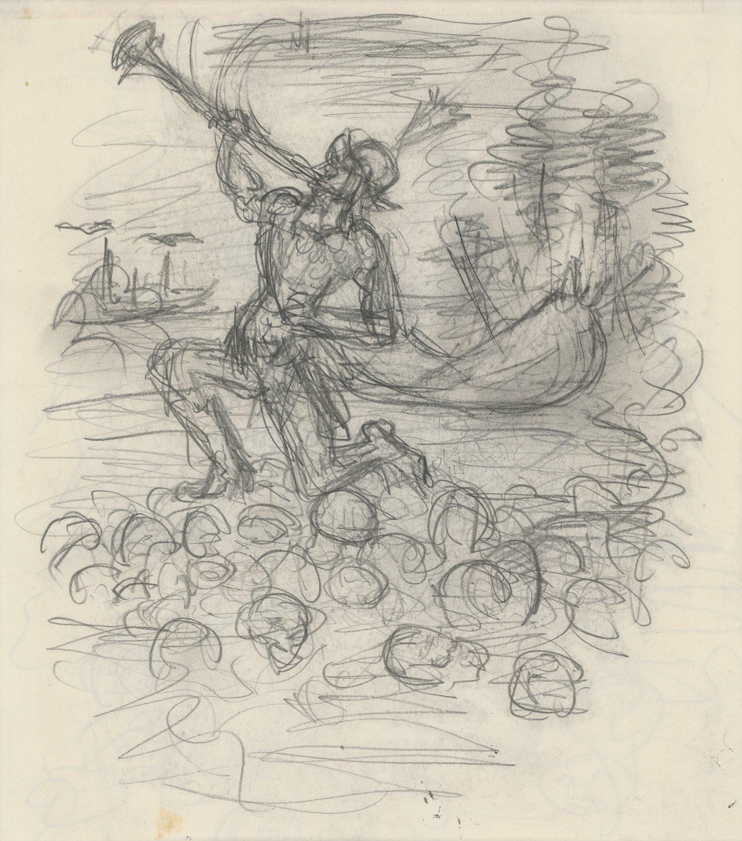 "Die Flucht" diente wohl als Vorzeichnung zur Lithographie gleichen Titels, 1928 (Hoberg 104). Jeweils verso eine weitere Bleistiftzeichnung des Künstlers. Die skizzenhaften Figuren fängt Kubin mit den charakteristischen lockeren, leicht nervösen Linien ein, und stets haftet ihnen auch etwas Phantastisches an.