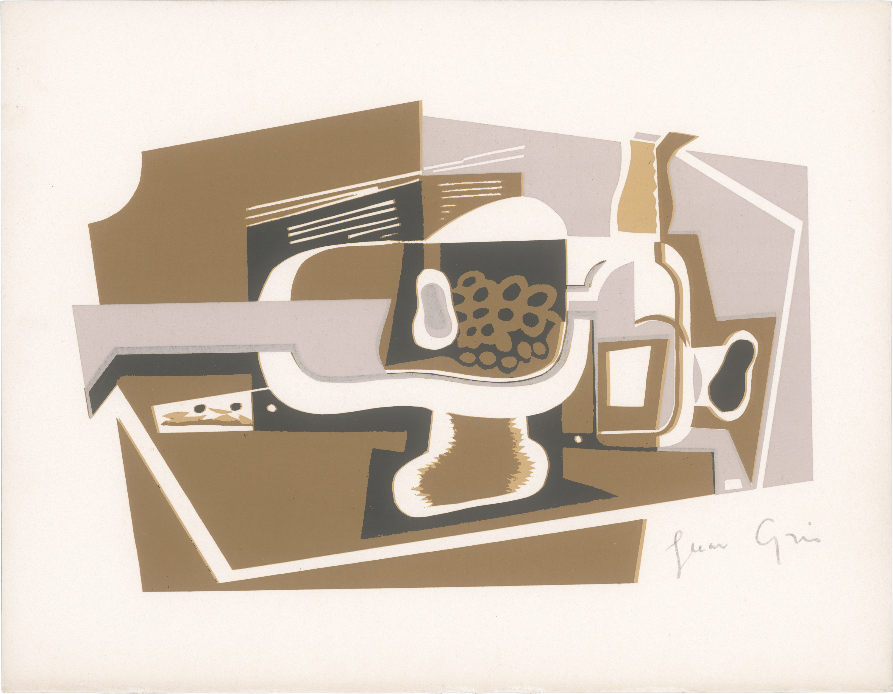 Juan Gris zählte, neben Pablo Picasso und Georges Braque, zu den wichtigsten Vertretern des synthetischen Kubismus. Dabei stand die Zusammensetzung eines Gegenstandes aus geometrischen Einzelteilen im Zentrum der Bildkomposition, was in der vorliegenden Arbeit klar ersichtlich ist. Gris bedient sich hier der klassischen Formensprache des Kubismus: Er wählt das Stilleben als Genre und platziert mittig die Gitarre, um die sich die restlichen Formen aufzuteilen scheinen. Plastizität wird in einer Bildebene suggeriert, die Perspektive und eine interpretative Illusion negiert. Herausgegeben von L'Esprit Nouveau, Paris, wohl als Neujahrsgabe 1923, in einer unbekannten Auflagenhöhe. Ausgezeichneter, malerische Werte umsetzender Druck, der in die reife Schaffensphase des Künstlers fällt, mit Rand.