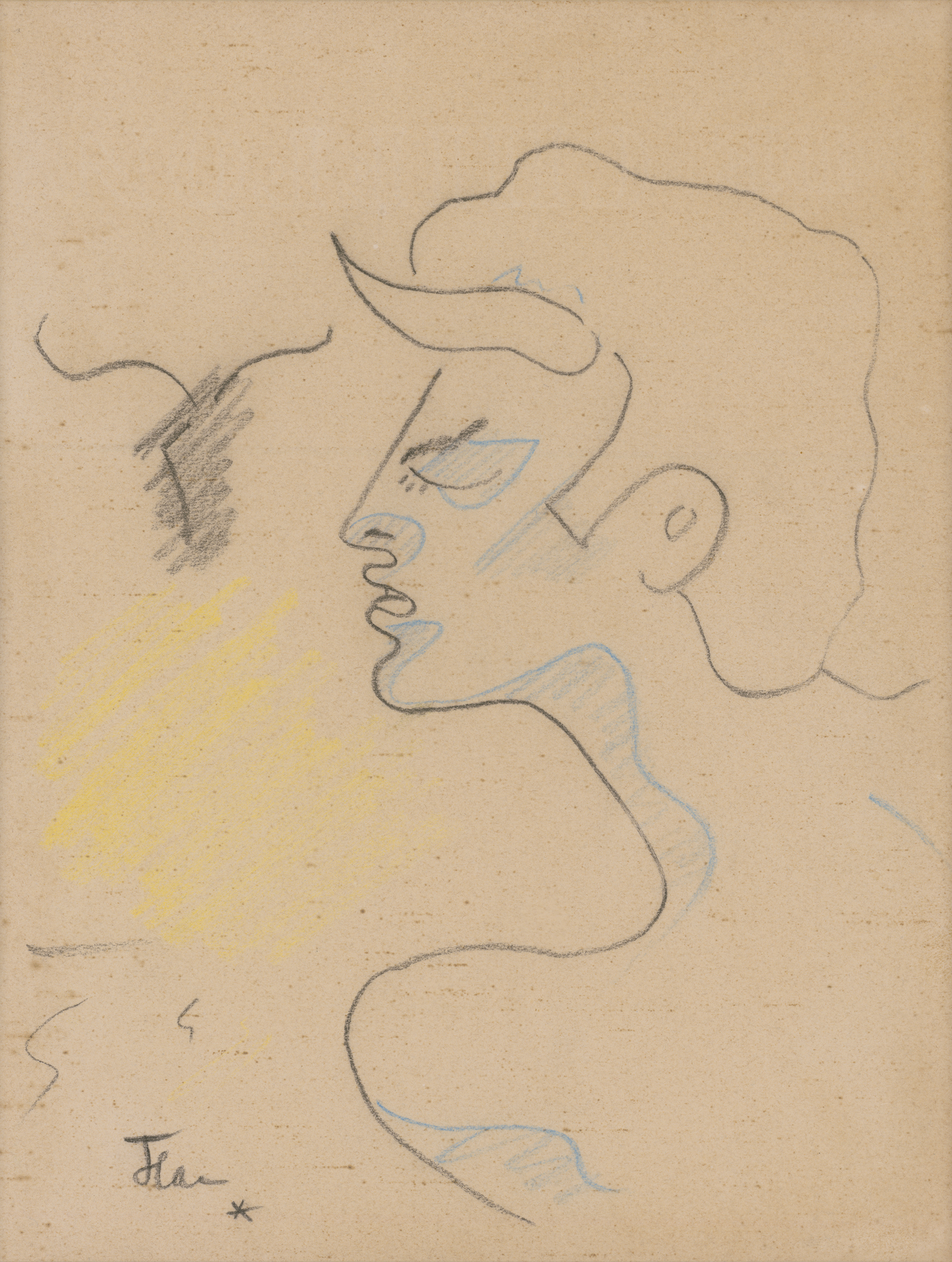 Den Juli 1953 verbrachte Cocteau mit Freunden in Spanien, wo der Künstler an zahlreichen Stierkämpfen teilnahm und den Flamenco für sich entdeckte. Vermutlich im Zusammenhang mit dieser Reise entstand die elegante kleine Zeichnung eines seiner charakteristischen "Homme-Toro". Der Universalkünstler Cocteau - Dichter, Schriftsteller, Filmregisseur und Maler - zeichnet die charakteristische Profildarstellung mit fließenden Konturlinien und sparsamen farbigen Schraffuren. Zu seinem Freundeskreis zählten Igor Strawinsky, Edith Piaf, André Gide, Marcel Proust und Edmond Rostand, er stand in Kontakt mit berühmten Künstlern wie Pablo Picasso und Charlie Chaplin. Wir danken Annie Guedras, Périgeux, für freundliche Hinweise vom 02.04.2025.