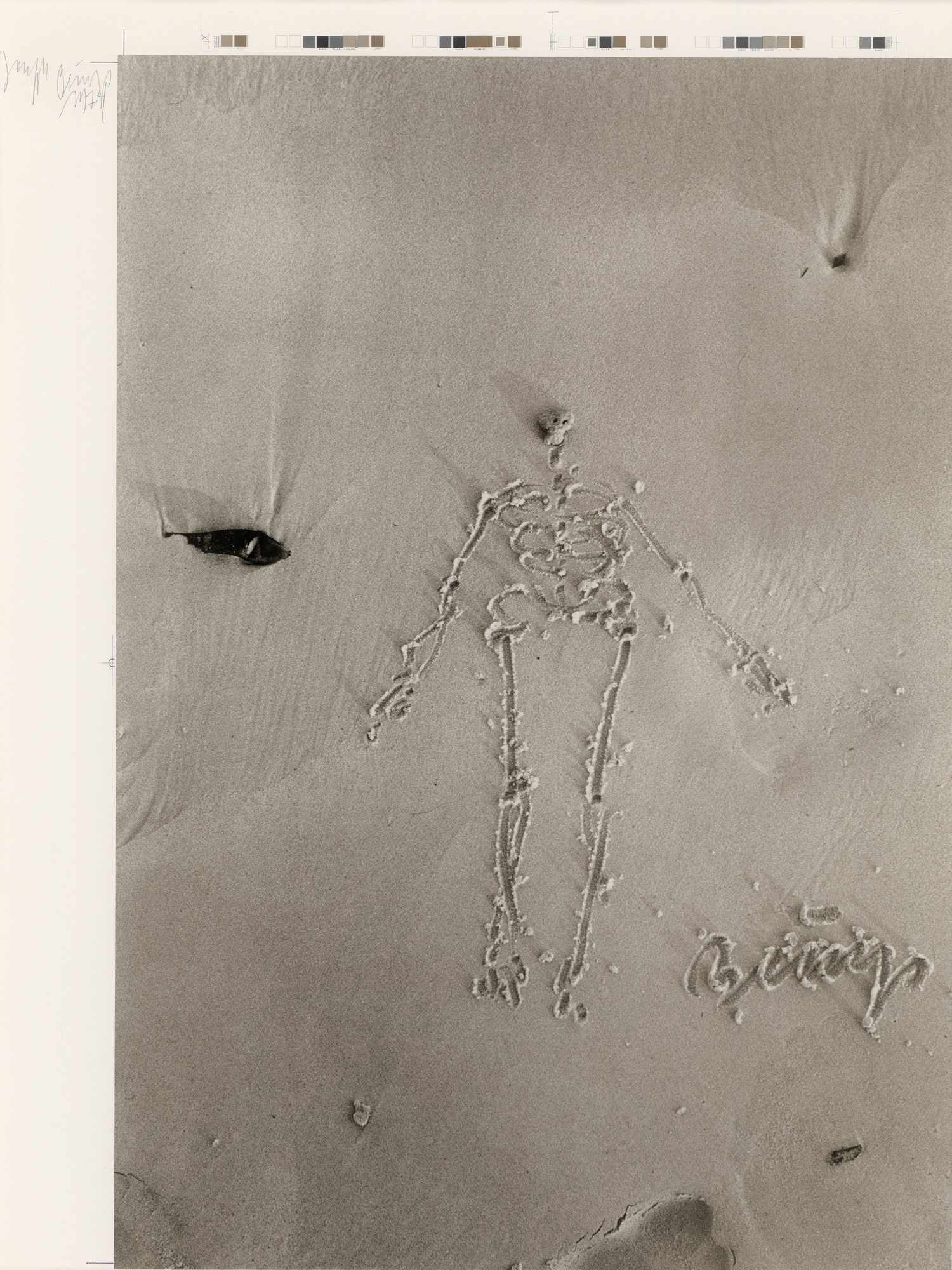 Sandzeichnungen als Inbegriff der Vergänglichkeit, fotografisch festgehalten und dann sogleich vom Meer wieder weggespült. Die elf Zeichnungen Beuys' und sieben Fotografien von Charles Wilp entstanden zum Jahreswechsel 1974/75 in Diani an der Küste Kenias. Erschienen in einer Gesamtauflage von 265 Exemplaren im Fey Verlag, Stuttgart 1978. Ausgezeichnete Drucke mit dem vollen Rand.