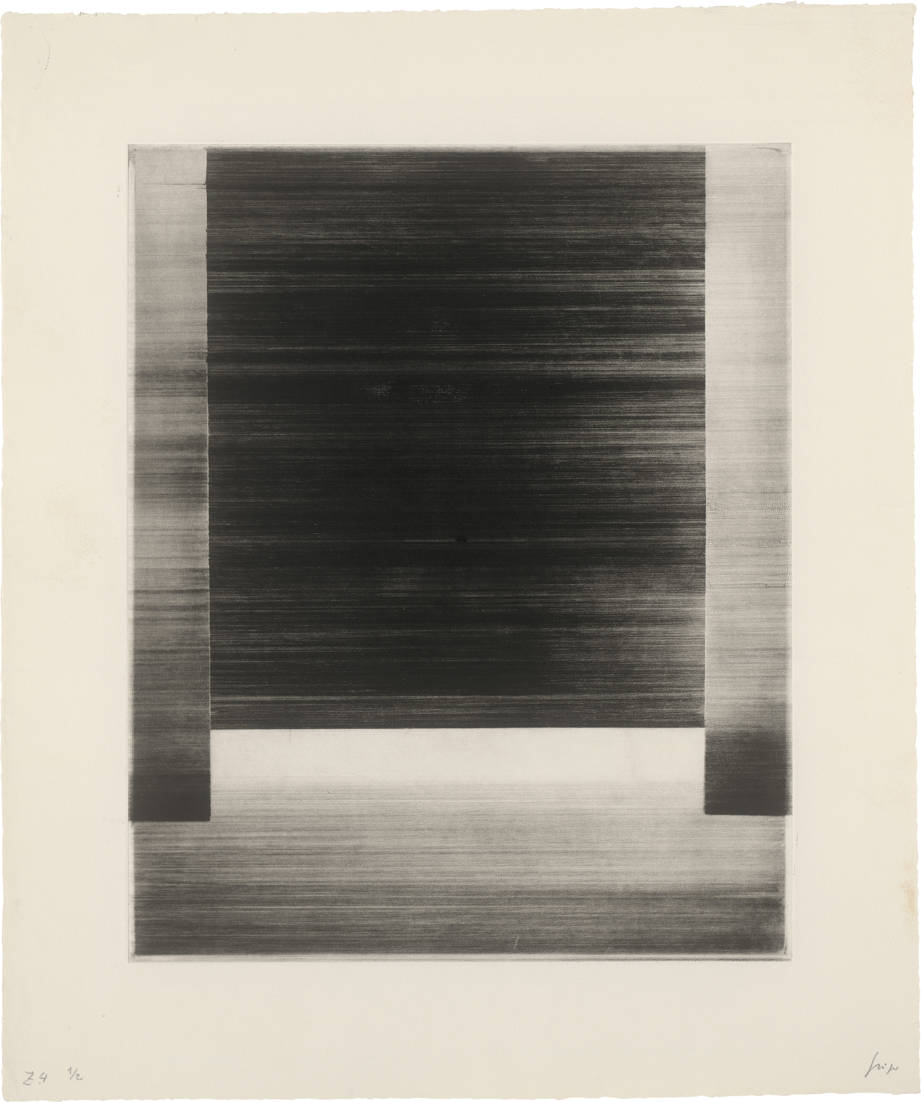 Folge von vier Kaltnadelarbeiten, alles Exemplare außerhalb des in einer Auflage von 22 numerierten, signierten Exemplaren erschienenen Mappenwerks "Rupprecht Geiger - Vier Radierungen". "In den 60er Jahren tritt die Form und ihre kompositionelle Verknüpfung zunehmend hinter der Dominanz der Farbe zurück. (...) Die Radierungen, denen Geiger mit Roulette und Lineal die differenziertesten Grauschattierungen abgewinnt, erlauben die Konzentration auf ein wesentliches, durch den Lichtcharakter bedingtes Farbmoment: Die Hell-Dunkel Wirkung." (Heinz Schütz, aus dem Text zur Mappe). Sämtlich prachtvolle, nuancenreiche Drucke mit dem vollen Rand. Sehr selten.