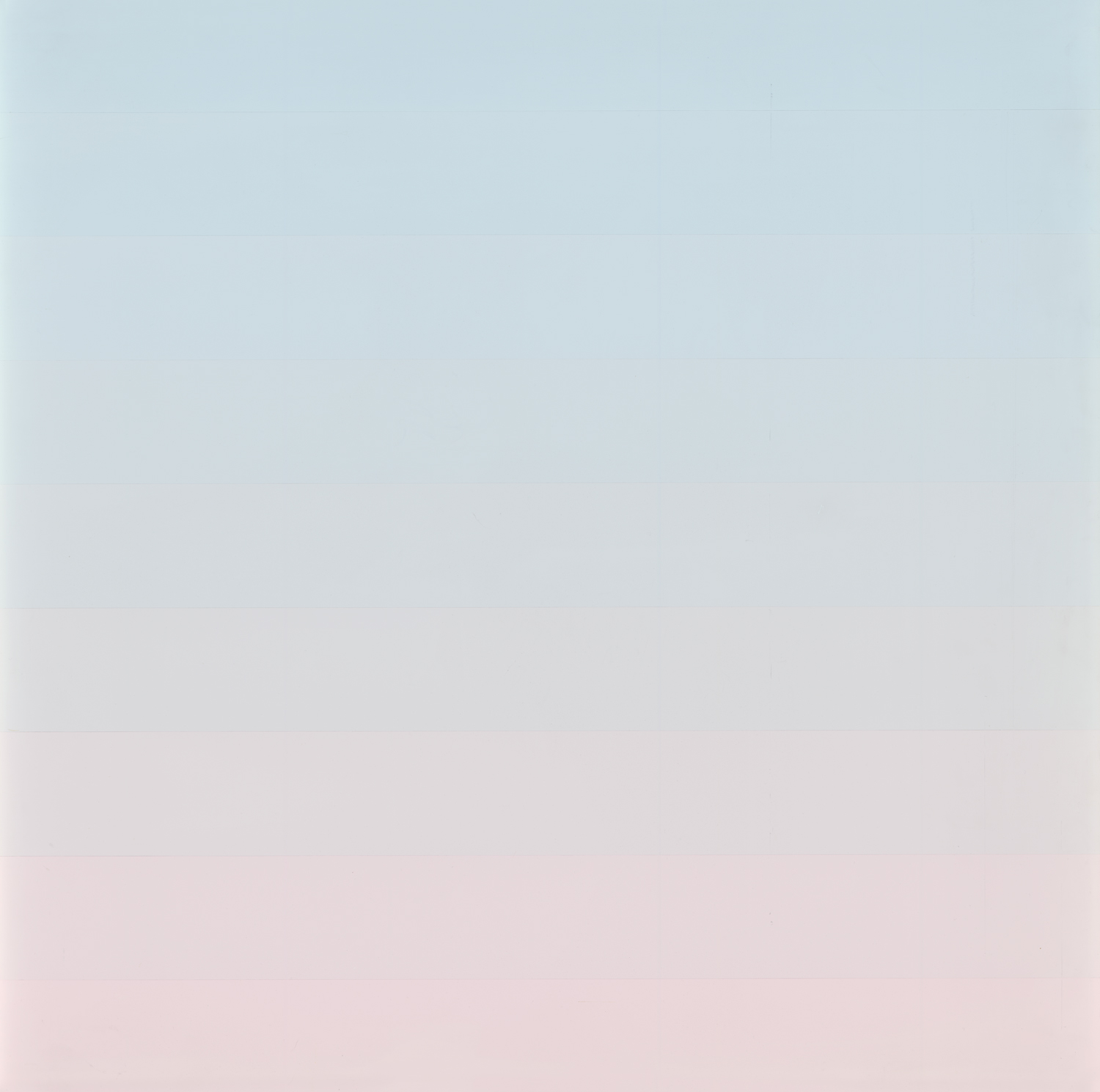 Zwischen Zartblau und Hellrosa changierende Streifenkomposition des Künstlers mit irisierender Wirkung. „Séquences chronomatiques“ (Farbstufenbilder) nennt Roeckenschuss, wichtiger Vertreter des frühen Minimalismus, seine um 1975 begonnene und bis um 2000 fortgesetzte Serie von streng vertikal angelegten Streifenbildern. Er malt oder collagiert dazu Reihungen vertikaler farbiger Streifen, mal schmal und lang, mal breit und kurz, immer jedoch stehen die Streifen in einem raffinierten mathematisch-musikalischen System zueinander. Seine Arbeiten sind in internationalen Sammlungen wie beispielsweise dem Museum of Modern Art in New York, der Sammlung der Deutschen Bank sowie der Daimler Chrysler Collection vertreten. Im Künstlerrahmen.