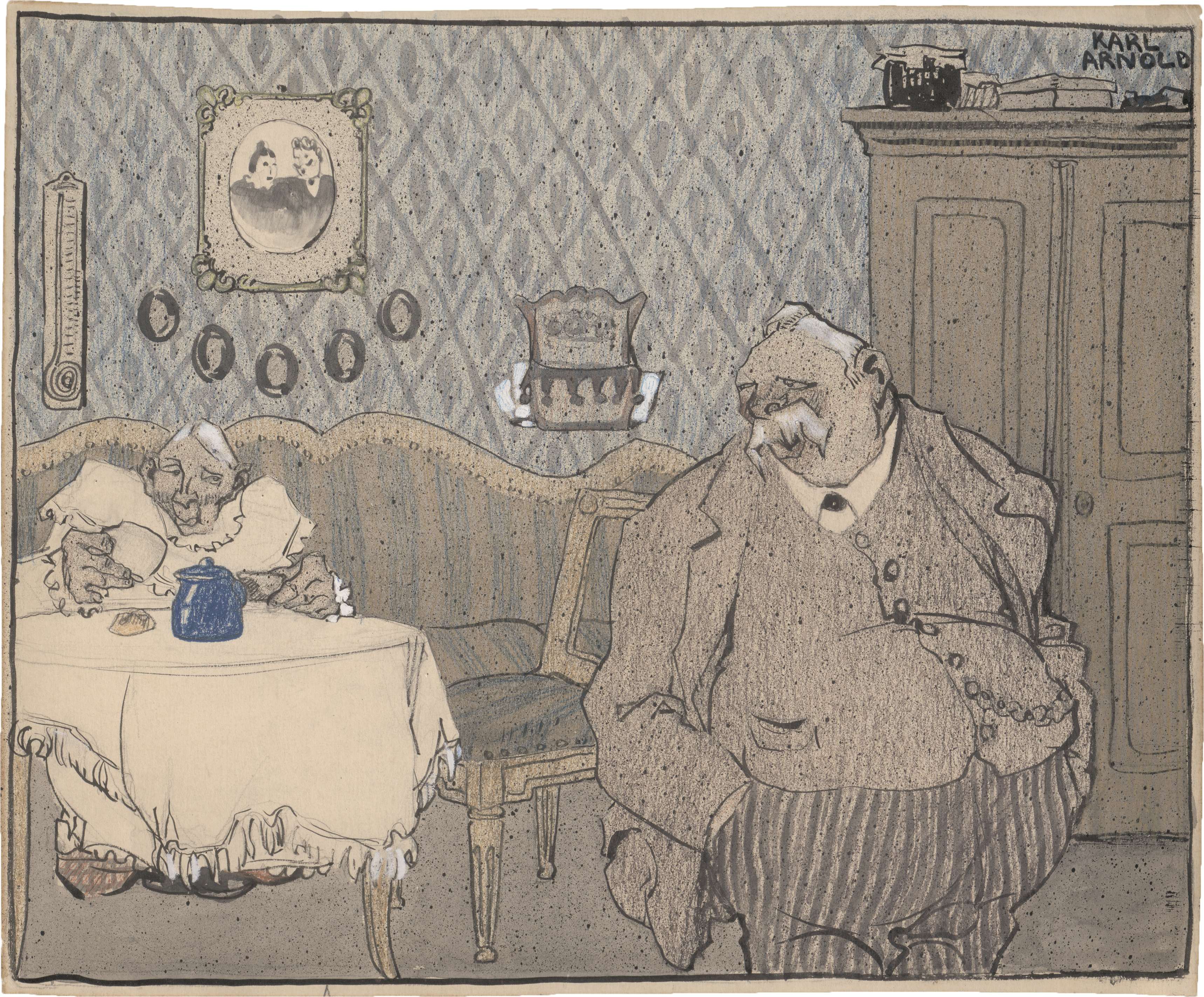 Die Enge des kleinbürgerlichen Wohnzimmers schildert Arnold präzise in der detailliert farbig ausgearbeiteten Zeichnung, die Spritztechnik liegt wie ein flirrender grauer Schimmer über der Szene. "(...) mit liebevoller Pedanterie wird in genau ausgefahrenen Umrissen das Profil des deutschen Spießers auf die Nadel gepiekst als handele es sich um die Varietäten eines seltsam gewachsenen, besonders hässlichen Insekts." (Eberhard Roters, in: Karl Arnold. Typen und Figuren der Zwanziger Jahre, Ausst.-Kat. Wilhelm-Busch-Museum, Hannover u.a. 1989, S. 34).