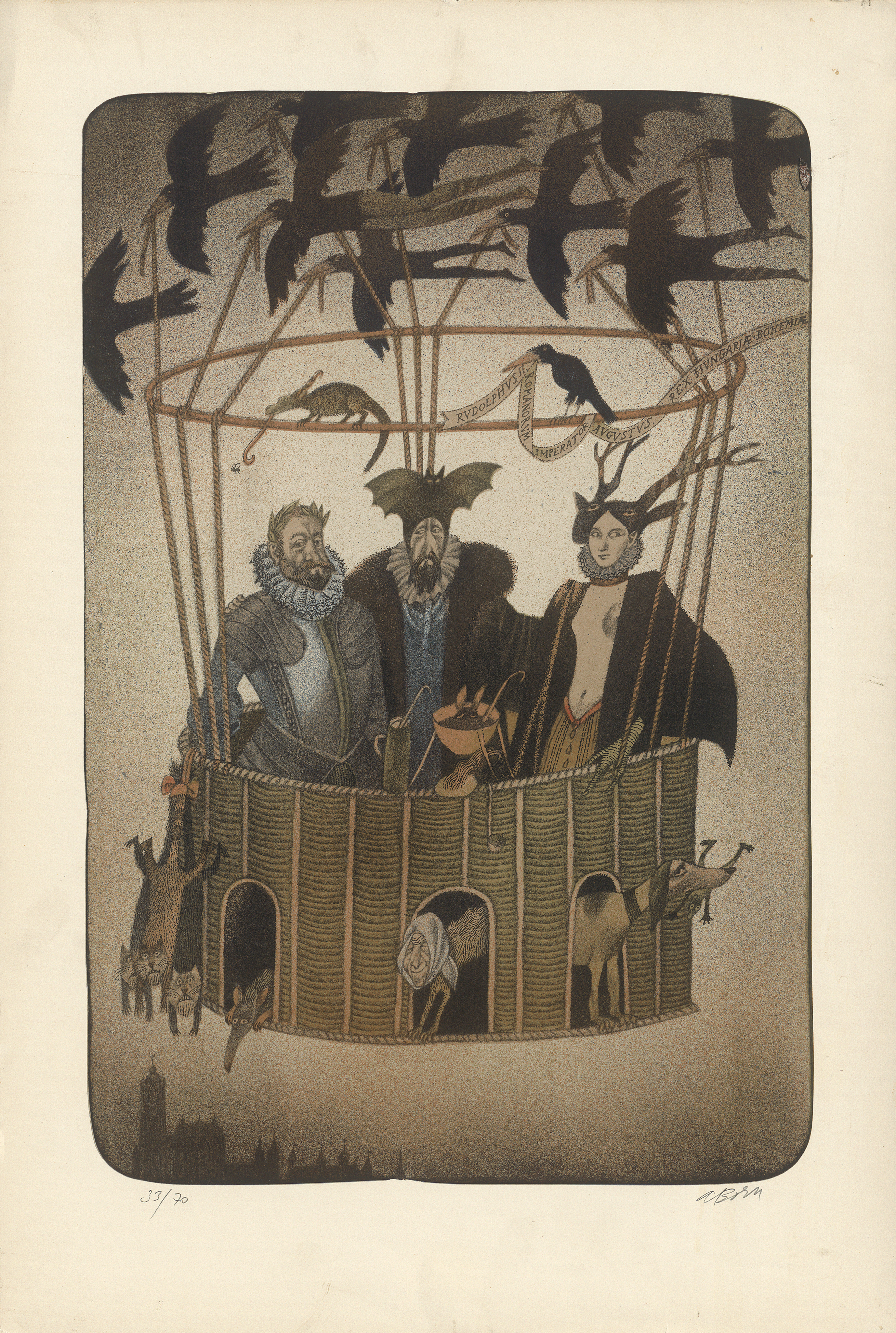 Kaiser Rudolf taucht als Figur immer wieder im Schaffen Adolf Borns auf, hier als Reisender im Luftschiff über Prag. Phantasievoll gestaltete Mischwesen aus menschlichen und tierischen Gestalten bevölkern die skurrile Komposition. Prachtvoller Druck mit Rand.