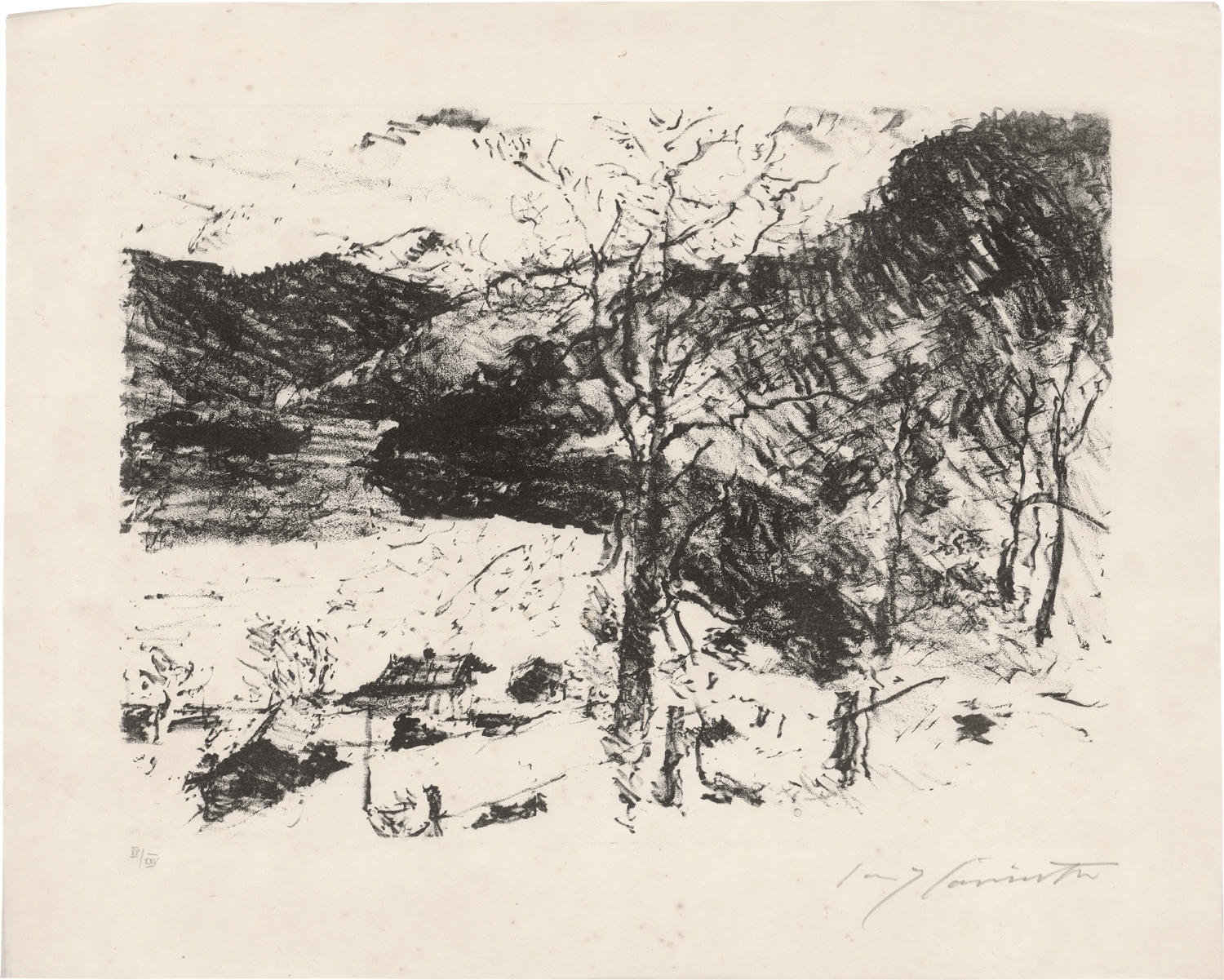 Vier (von fünf) Blatt der Mappe "Vorfrühling im Gebirge", erschienen im Euphorion-Verlag, Berlin, in einer Gesamtauflage von 156 Exemplaren. Vorhanden sind die Motive "Frühling am Walchensee", "Berg-See", "Tal-Grund" und "Buchenwald". 1919 kaufte Lovis Corinth ein Grundstück in Urfeld am Walchensee. Sein Haus dort diente dem Künstler als Rückzugsort, wo er auch die Landschaftsmotive der Mappe fand. Gedruckt bei Hermann Birkholz, Berlin. Prachtvolle Drucke mit dem vollen Rand.