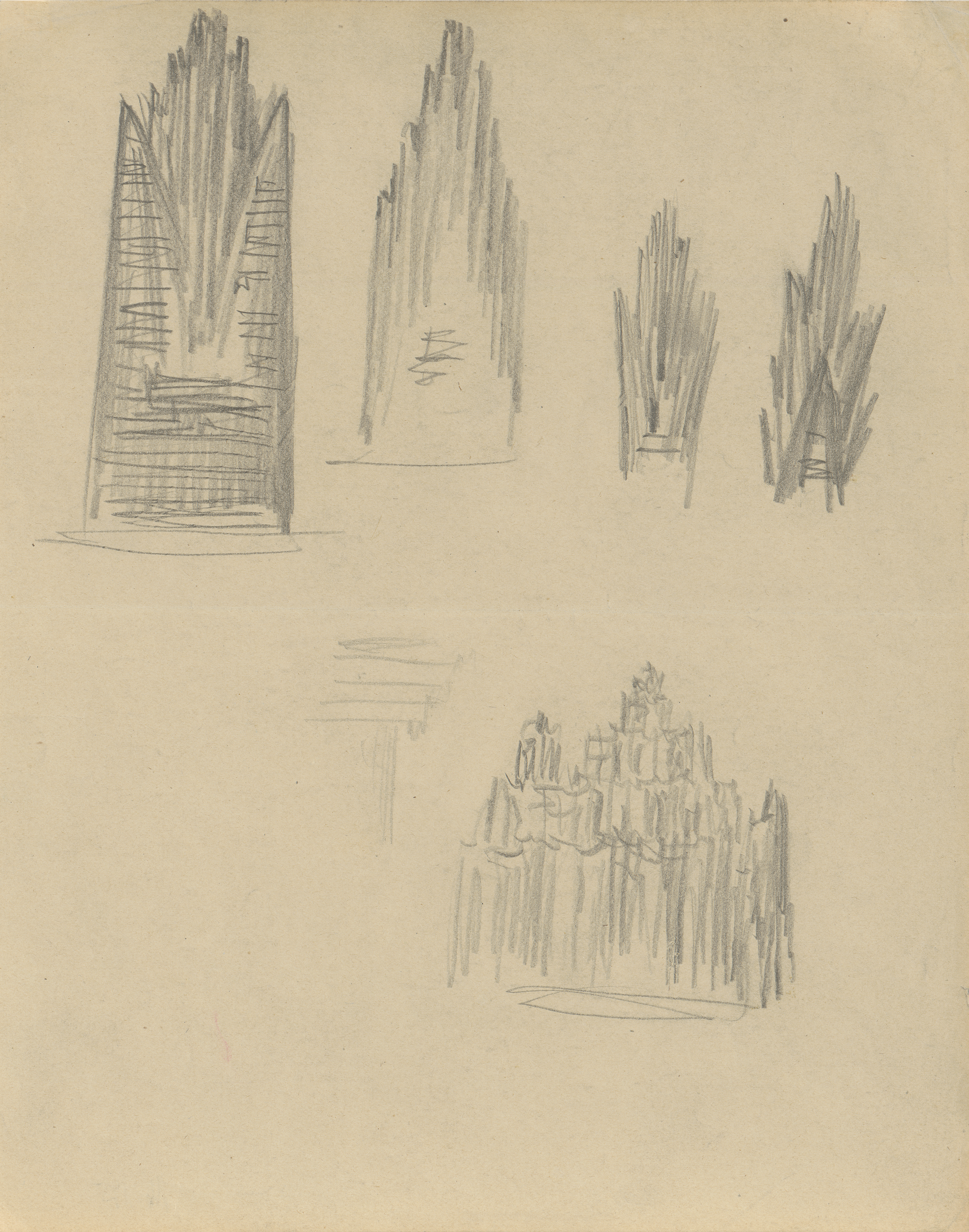 Aufrissentwürfe für die Kapelle der Majolika-Manufaktur Karlsruhe. Die kristalline Wirkung des Entwurfes spiegelt sich in den verschiedenen Formvarianten, die Poelzig hier zeichnet, ob eher an einer gotischen Kathedrale oder einer Flamme orientiert.