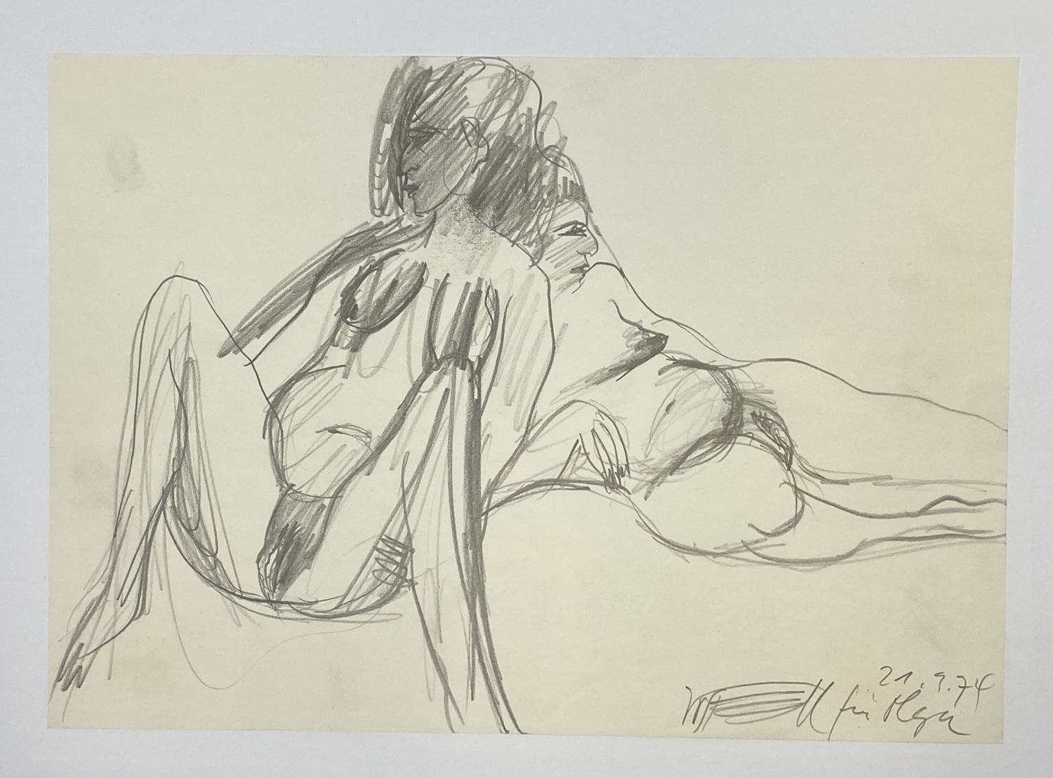Mit lockerem, schwungvollem Strich ausgeführte Aktstudien jeweils zweier Frauen, sowie eine offenbar spontan im Pariser Restaurant entstandene kubisch-organische Komposition. Aus dem Wechsel zarter Bleistiftlinien, tiefschwarzer Schraffuren und grau nuancierter Schattierungen entstehen reizvoll gestaltete Studien. Vostell, einer der Pioniere des Environment, der Videokunst, des Happening sowie der Fluxus-Bewegung, beschäftigte sich immer wieder mit abstrahierten Figuren, die deutlich den Blick des Bildhauers erkennen lassen.