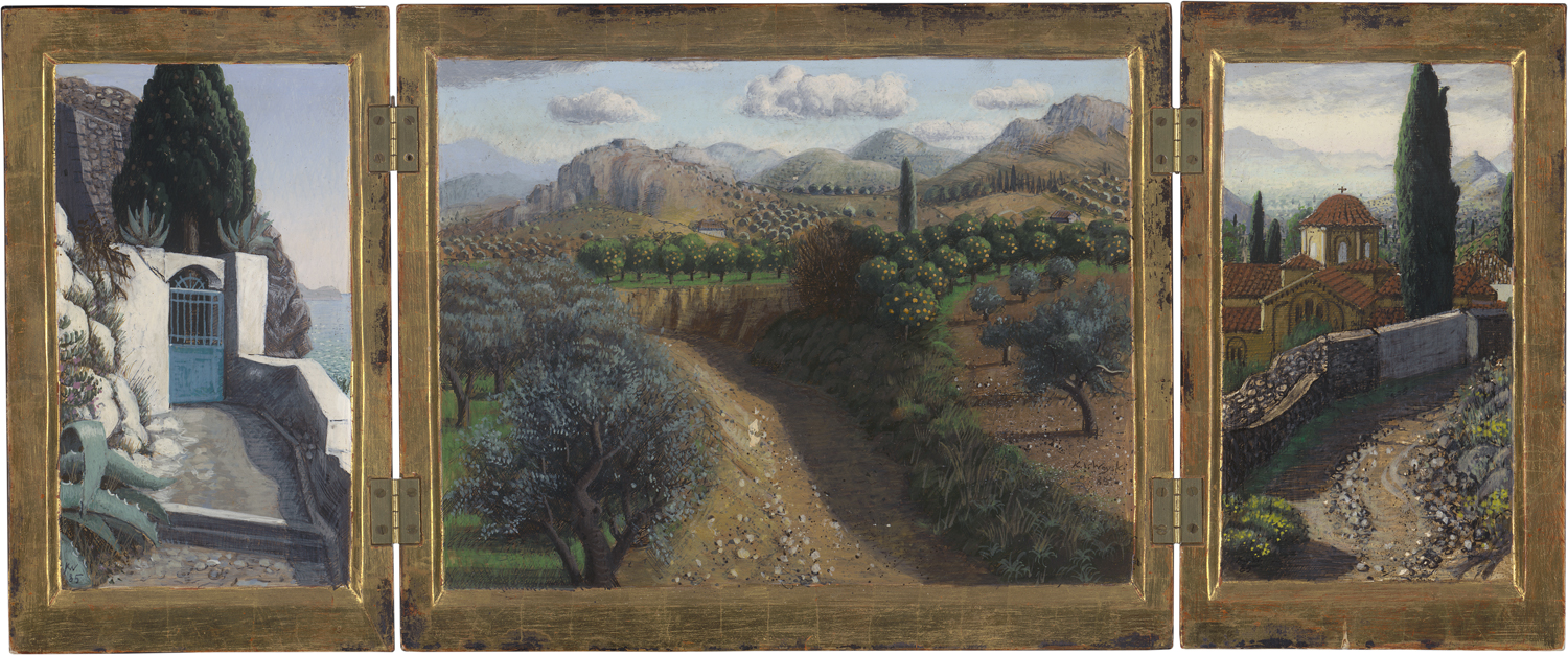 Triptychon. Öl auf Holz mit vergoldetem Rahmen, die Platten außen versilbert. 1985.