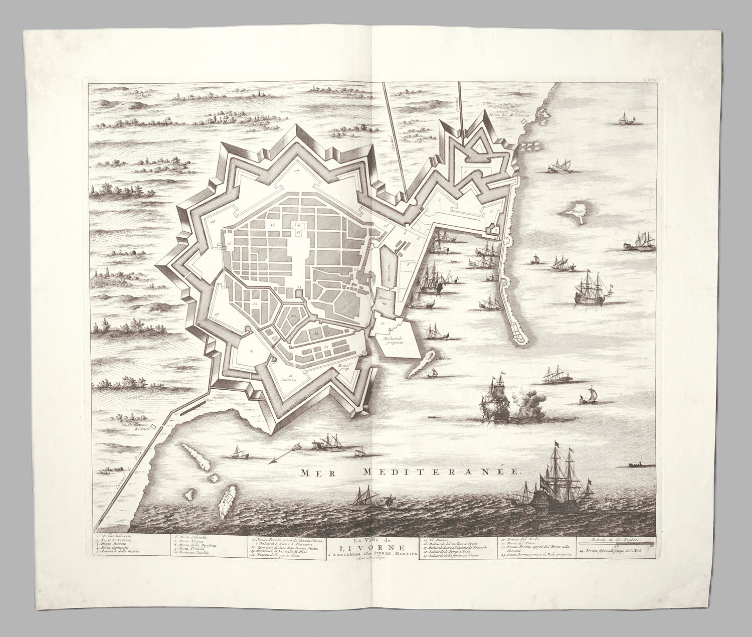 Koeman, I, Bl 83. – Sehr schöner gestochener Plan des Hafens und der befestigten Stadt Livorno mit zahlreicher Schiffsstaffage und einer Legende am unteren Bildrand. – Mit Mittelfalz, papierbedingt gebräunt, etwas braunfleckig sonst wohlerhalten.
