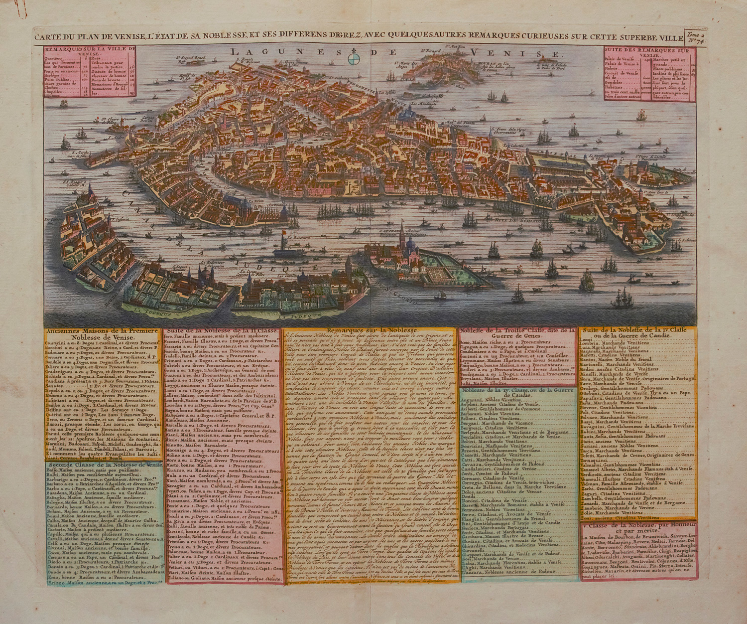 Aus der Vogelperspektive erfasst, zeigt sich die Lagunenstadt in ihrer vollen Größe und samt der zugehörigen Inseln. Der Canal Grande ist von einer Vielzahl an Segelbooten und kleineren Schiffen belebt. Der unterhalb der Darstellung befindliche Text verzeichnet die in Venedig lebenden Adelsstände: "Anciennes Maisons de la Premiere Noblesse", "Seconde Classe de la Noblesse", "Suite de la Noblesse de la II. Classe", "Remarques sur la Noblesse", "Noblesse de la Troisieme Classe, dite de la Guerre de Genes", "Noblesse de la IV. Classe, ou de la Guerre de Candie", "Suite de la Noblesse de la IV. Classe ou de la Guerre de Candie" und letztlich "V. Classe de la Noblesse, par Honneur et par merite". Der Plan stammt aus Chatelains "Atlas historique". – Leicht gebräunt und stockfleckig. Im oberen linken Rand mit kleiner Rostspur und mit kleiner Fehlstelle am linken Rand, kleinen Einrissen – Dabei: Zwei weitere Kupferstiche aus Chatelains "Atlas historique": 1) Carte du gouvernement civil et politique de la republique de Venise, ses differens conseils, le palais de St. Marc et celui des procurateurs. Kupferstich. 44,5 x 53 cm. - 2) Carte du gouvernement militaire de la republique de Venise l’état de ses revenus de ses forces et les differentes vues de la place de St. Marc. - Die beiden Karten leicht gebräunt und braunfleckig.