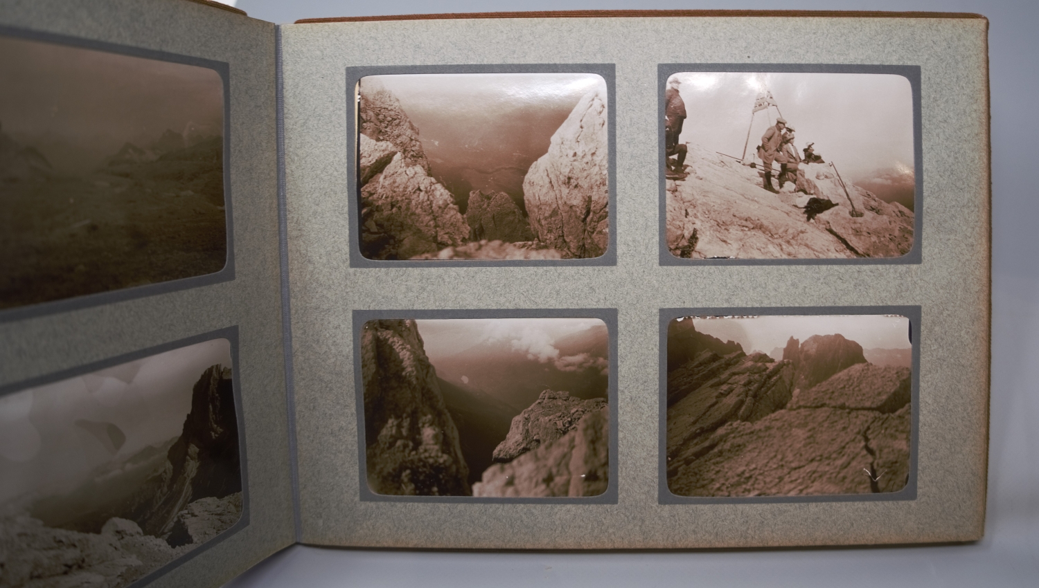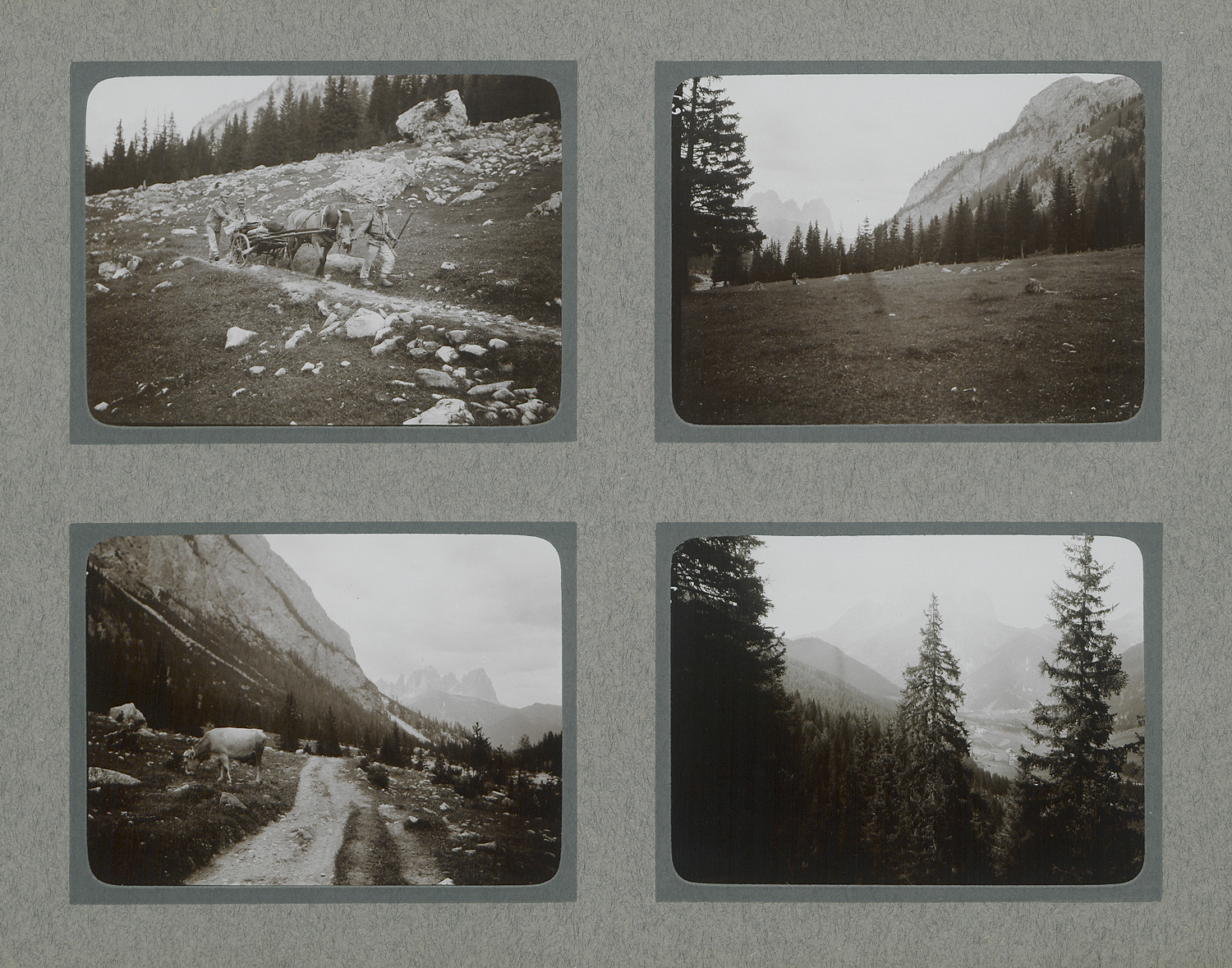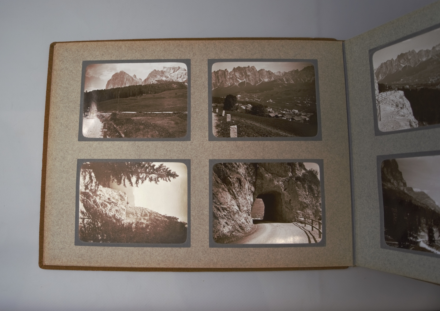 Das erste Blatt mit dem Titel "Dolomitenreise 1911". Die Bergwelt eindrucksvoll präsentierendes privates Fotoalbum mit Landschaften im klaren Licht und von Nebelschaden umwölkt, mit Gletschern, Seen, Berghütten, Tourgängen (die Damen in langen Röcken mit Kopfbedeckung) und gemeinsamer Rast. Mehrere Fotos zeigen eine Frau im Spiel mit einem Hund. Fotograf ist höchstwahrscheinlich, der Provenienz nach zu urteilen, der Art und Forschungsreisende Arthur Berger (1871-1947). – Wohlerhalten.